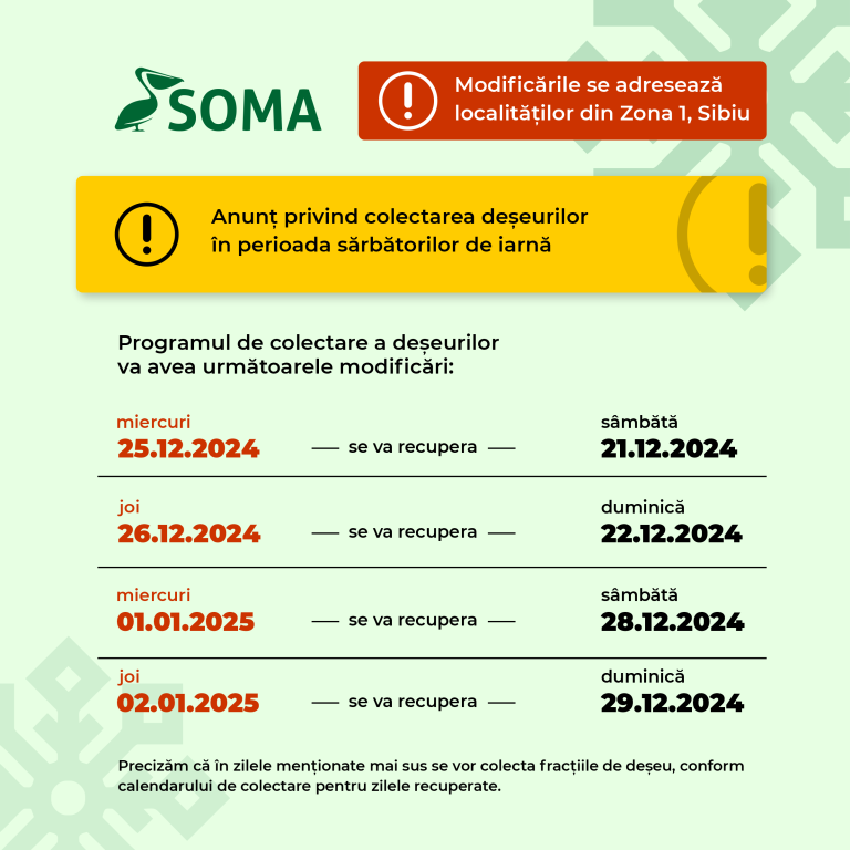 SOMA transmite programul de colectare a deșeurilor în perioada sărbătorilor de iarnă