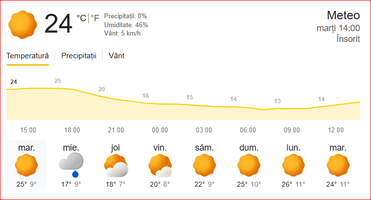 Săptămâna începe cu o zi superbă. Marți, soarele strălucește puternic, iar temperaturile ajung până la 25°C. Este o ocazie perfectă să vă bucurați de plimbări prin oraș sau să stați la terasă.