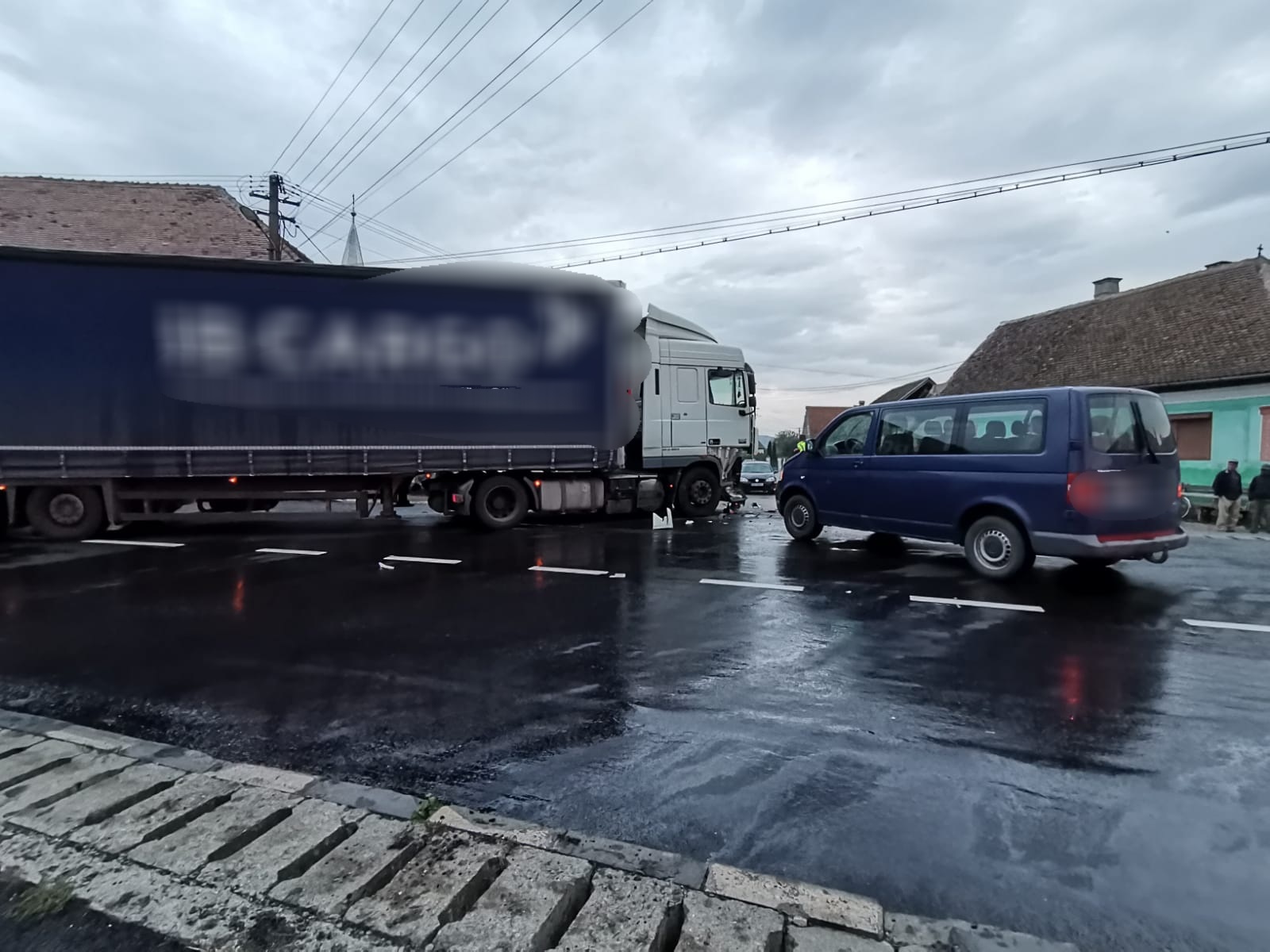 Traficul rutier este blocat complet la această oră pe Drumul Național 1 în Porumbacu de Jos în urma unui accident rutier produs între un TIR și un microbuz pentru transport persoane.