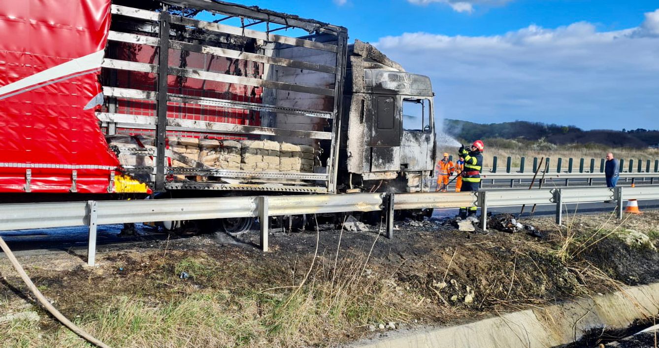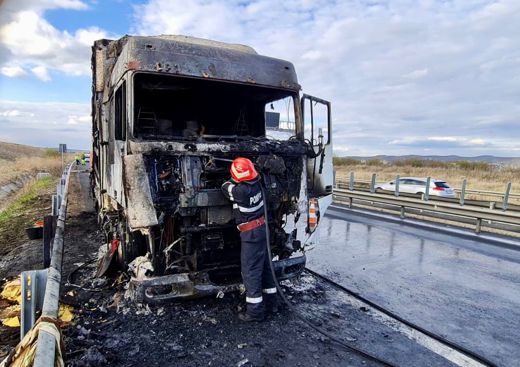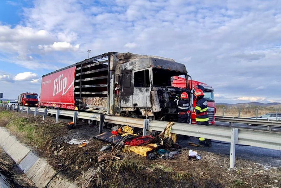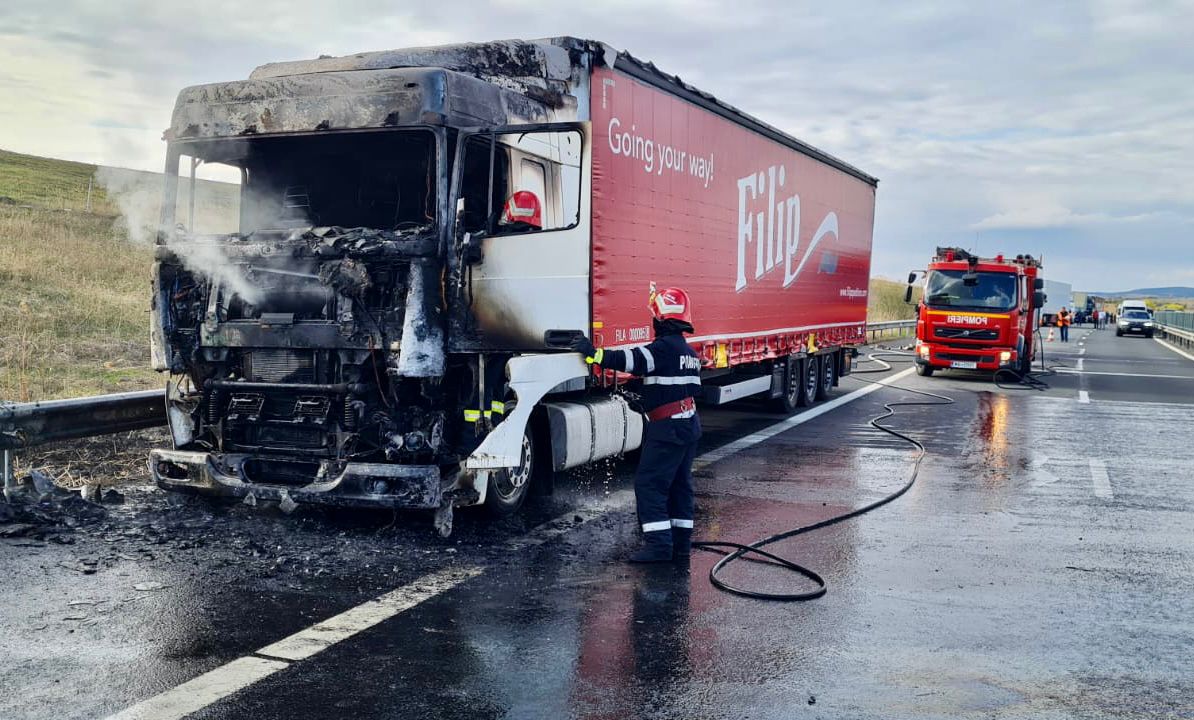 Pompierii au intervenit pe autostrada A1, în zona Aciliu, pentru stingerea unui incendiu izbucnit la un autocamion.