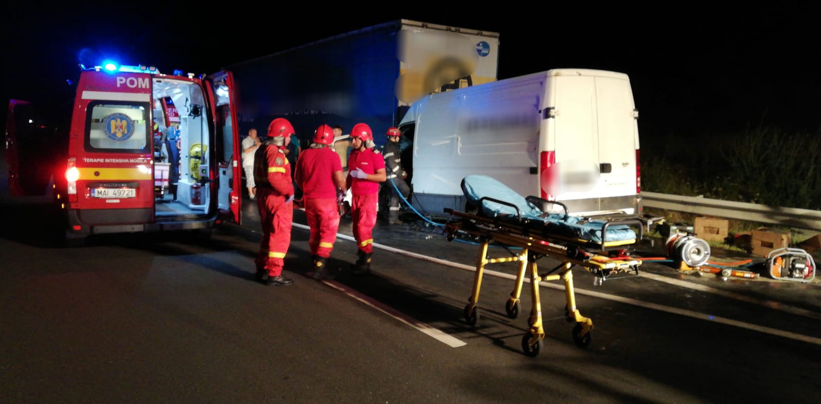 FOTO – Două persoane rănite după un impact violent între un microbuz și un TIR