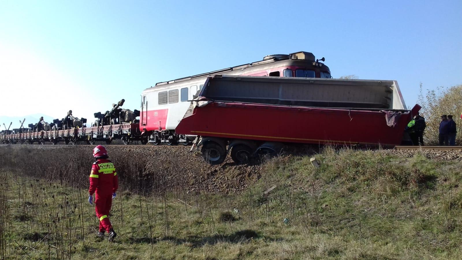 Un tren marfar care transporta tancuri și care circula de la Brașov la Sibiu a lovit un autocamion în zona localității Mârșa, iar locomotiva acestuia a deraiat.
