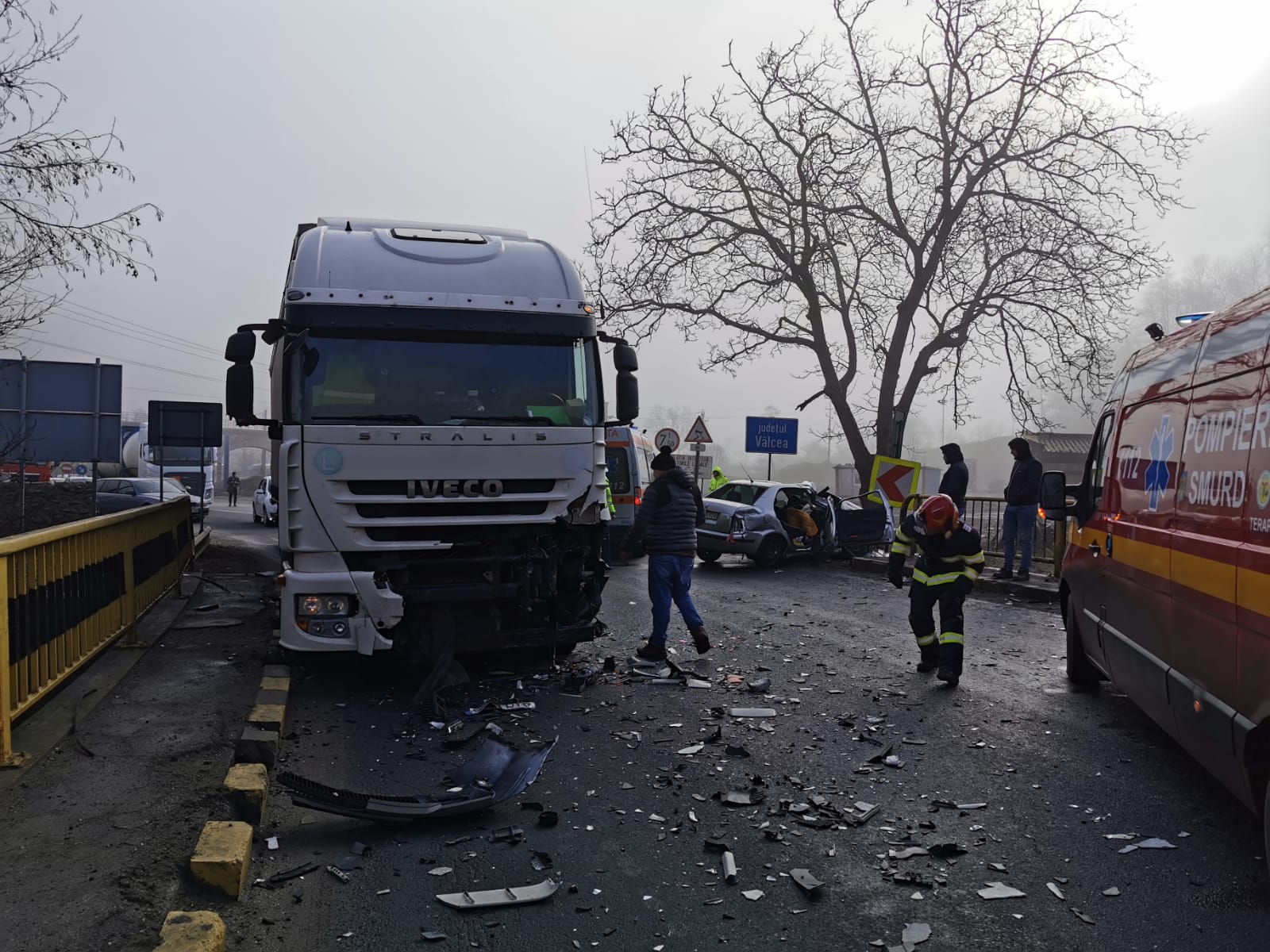 FOTO – Persoane încarcerate pe Valea Oltului după o coliziune între un TIR și autoturism