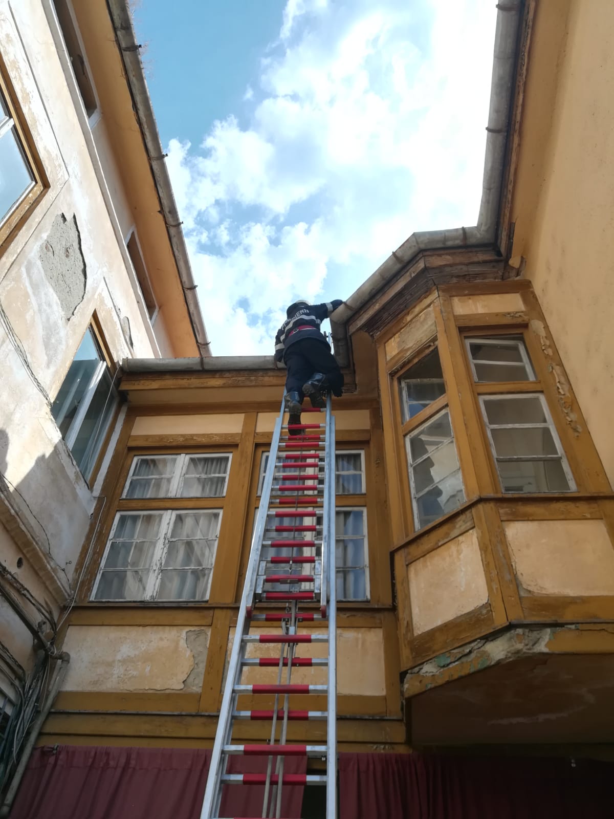 ISU Sibiu a intervenit de urgență în municipiul Mediaș, în Piața Regele Ferdinand I, cu un echipaj de pompieri militari din cadrul Secției Mediaș pentru a salva o pisică rămasă pe acoperișul unui imobil.