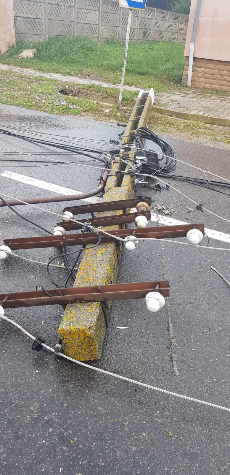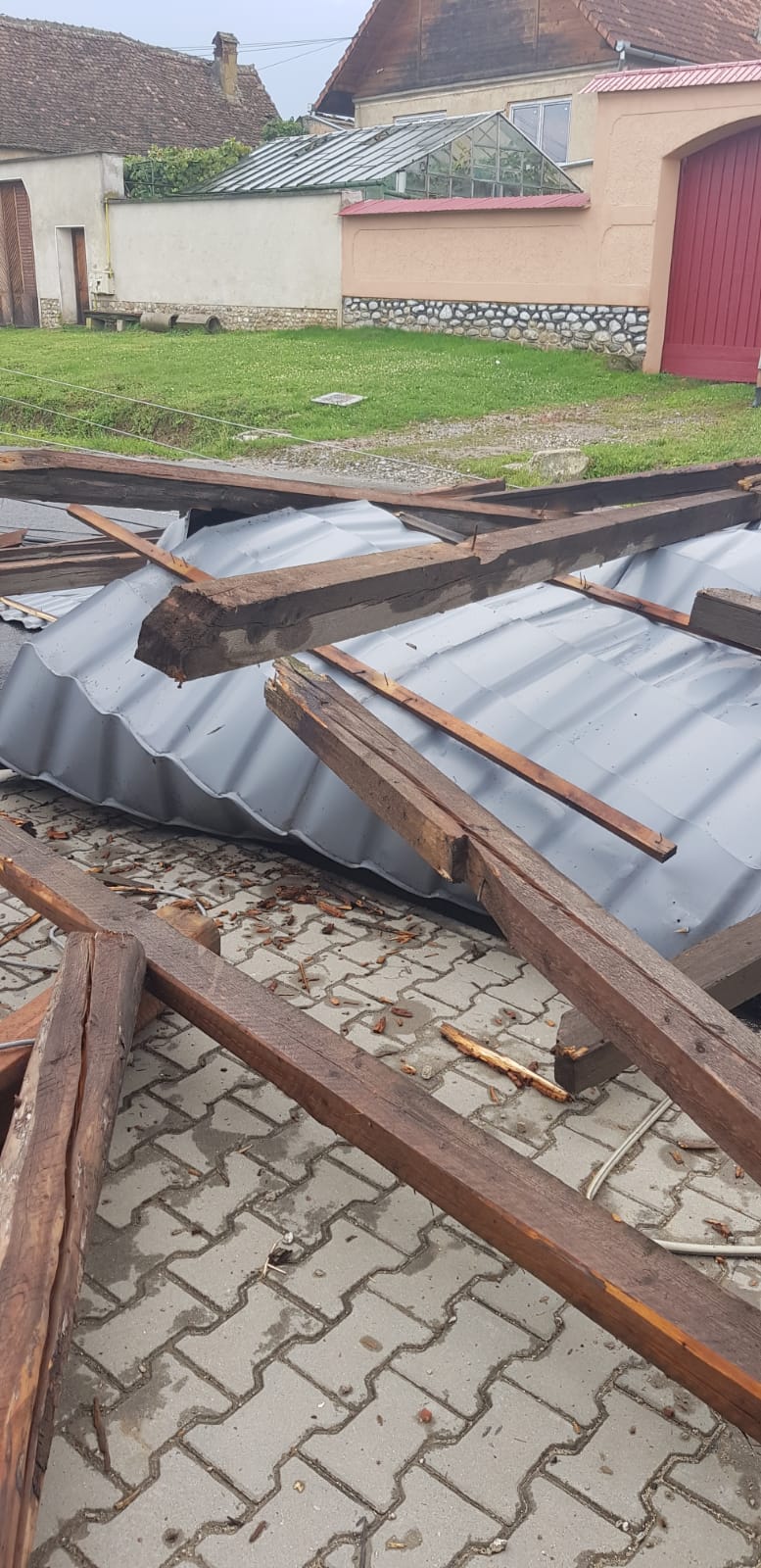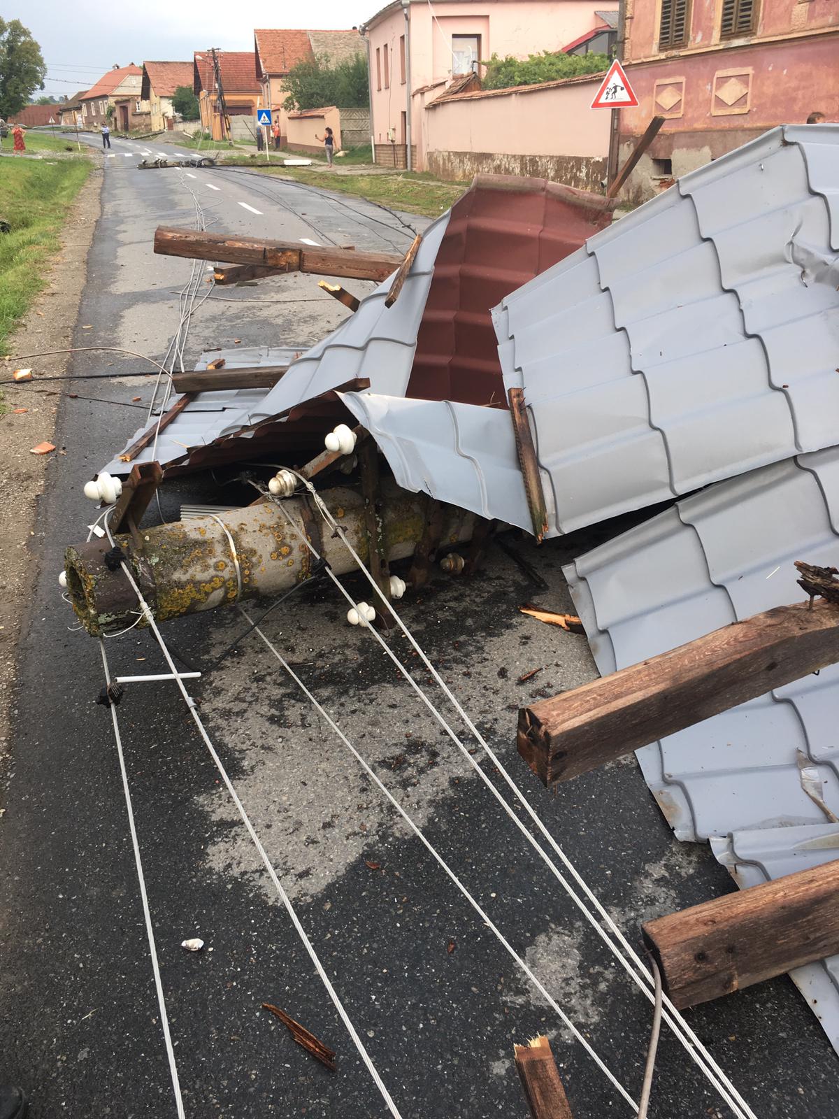 FOTO – Rezultatele vijeliei de joi: acoperiș distrus, stâlpi culcați la pământ și un autoturism avariat