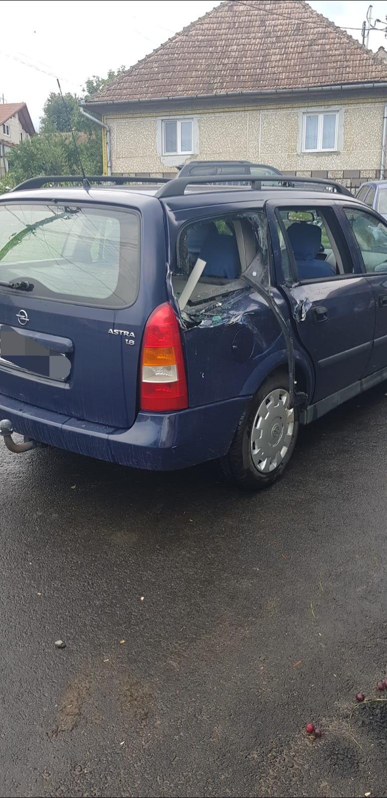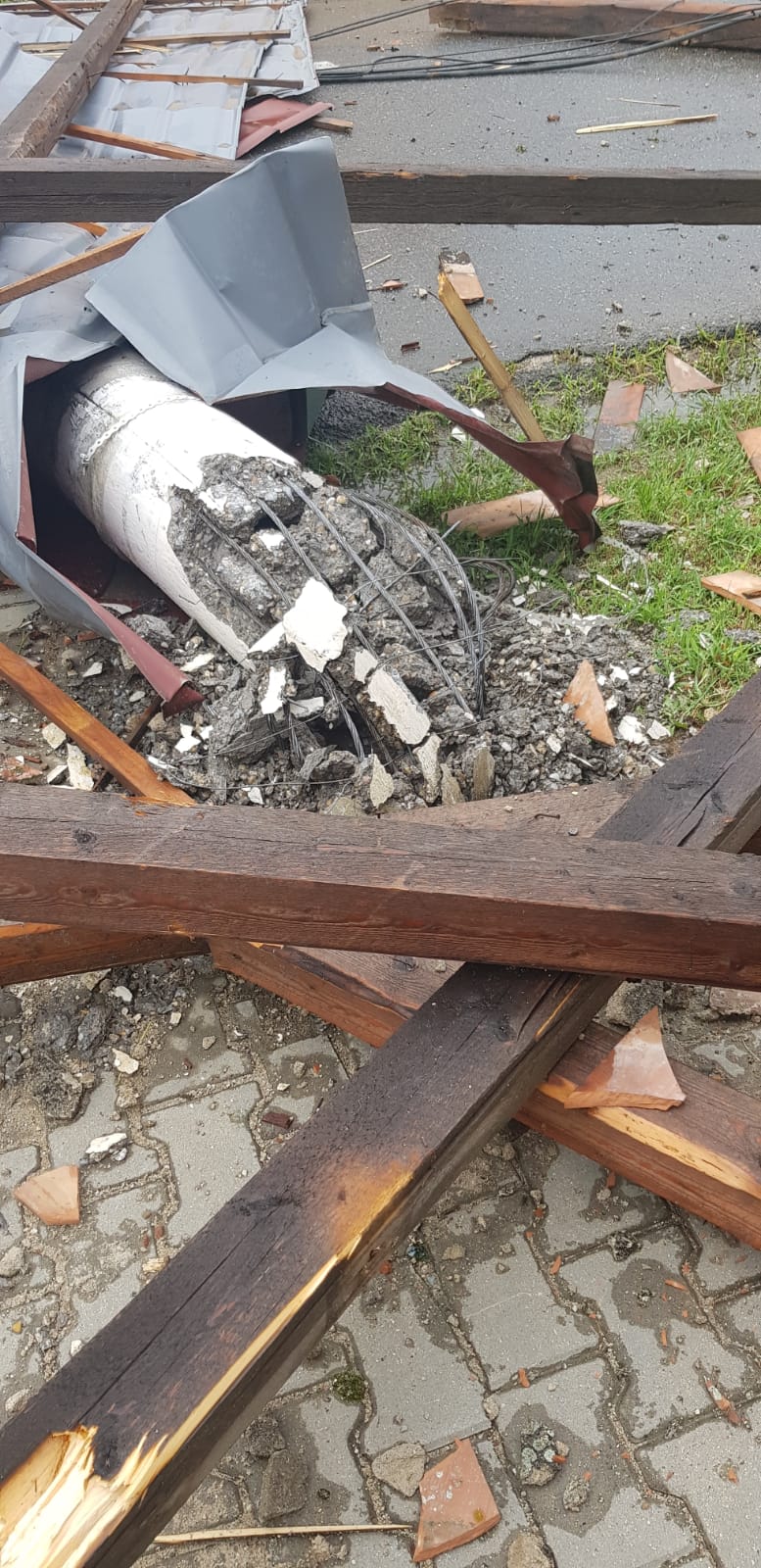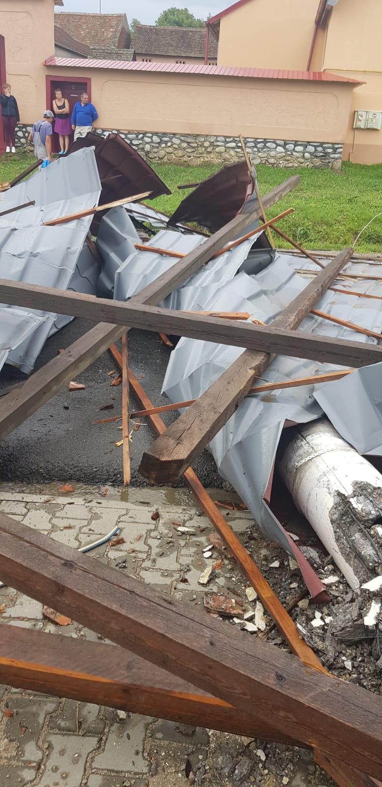 FOTO – Rezultatele vijeliei de joi: acoperiș distrus, stâlpi culcați la pământ și un autoturism avariat