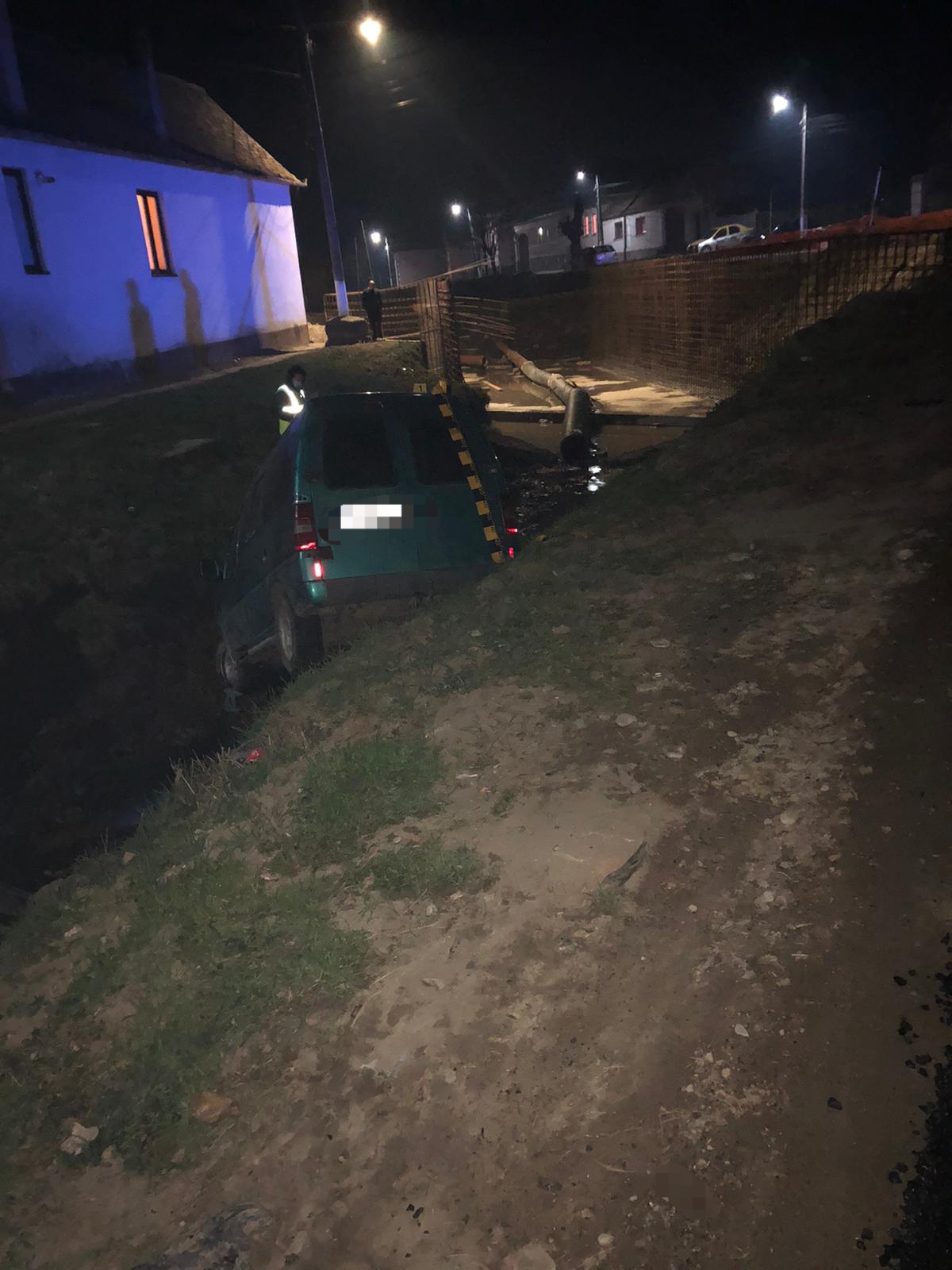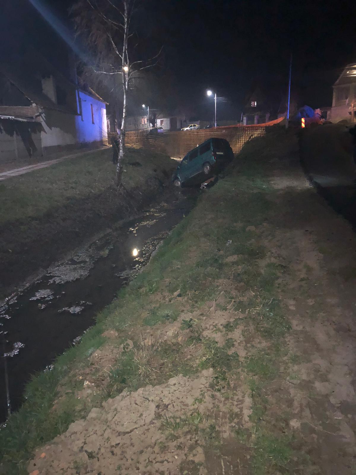 Pe strada Principală din localitate, într-o curbă ușoară la dreapta, șoferul unui autoturism a pierdut controlul direcției de deplasare și a ieșit de pe șosea în zona unui pod aflat în construcție, la o diferență de nivel de aproximativ doi metri. Șoferul și soția sa au fost răniți în urma impactului.