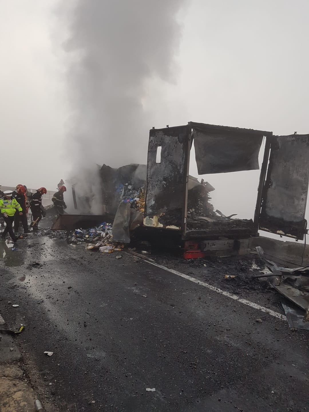 Incendiul care a cuprins TIR-ul de pe Drumul Național 1, în zona localității Bradu, a distrus în întregime mastodontul.