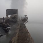FOTO – TIR-ul care a luat foc la Bradu, distrus în întregime. Echipe de scafandri din 3 județe caută persoana căzută în Olt