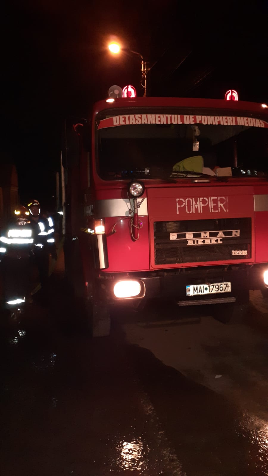 Pompierii medieșeni au reușit localizarea și stingerea incendiului după aproximativ o oră și jumătate. Trei bărbați, cu vârste cuprinse între 49 și 58 de ani au suferit arsuri de gradul I și II pe mâini, picioare și față și au fost transportați la Compartimentul Primire Urgențe al Spitalului Municipal Mediaș, iar ulterior transferați la Spitalul Clinic Județean Sibiu cu autospeciala de transport victime multiple.