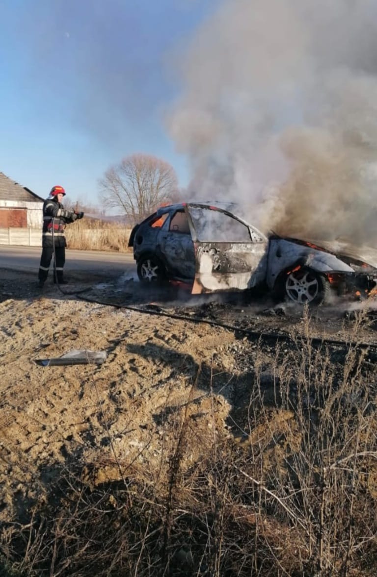Un autoturism a ars, miercuri după amiaza în urma unui incendiu violent produs la ieşirea din Iacobeni spre Agnita