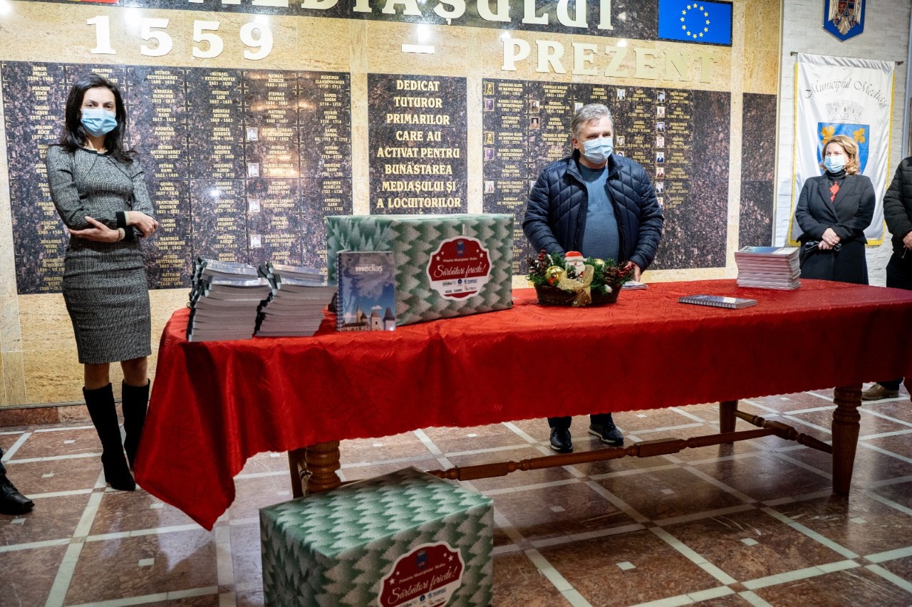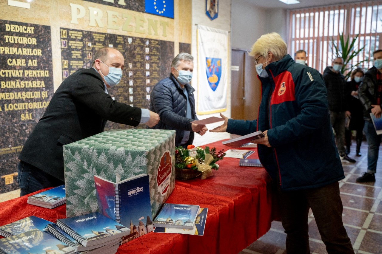La evenimentul desfășurat în prezența primarului Gheorghe Roman și a altor reprezentanți ai autorității publice locale, au fost recompensați 60 de voluntari medieșeni, care au primit diplome, dar și cadouri oferite de către municipalitate, în semn de recunoștință pentru implicarea deosebită pe care au avut-o de-a lungul anului 2021.