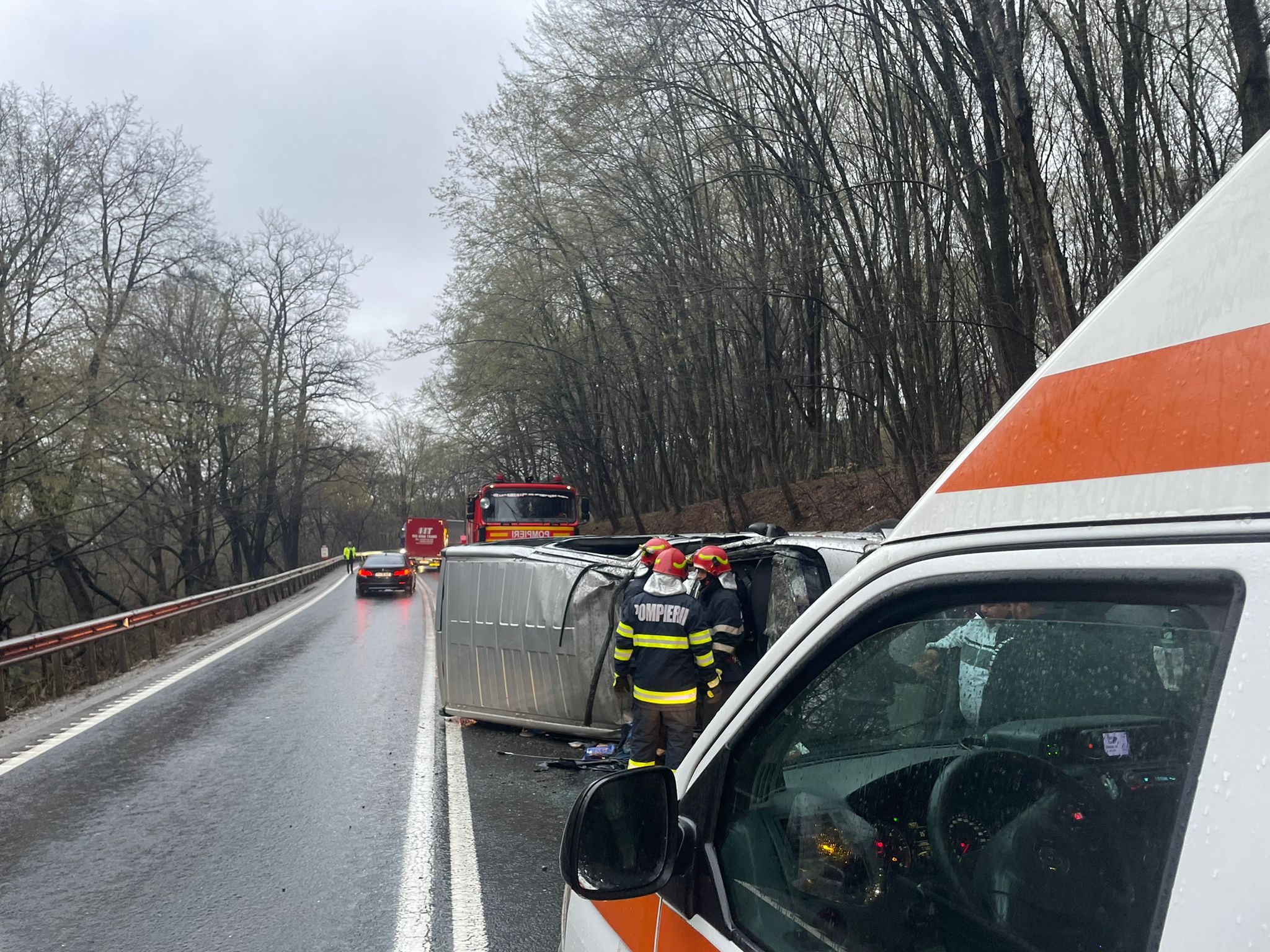 La locul evenimentului rutier intervin două echipaje SMURD, dintre care o autospecială pentru transport victime multiple, un echipaj de la Descarcerare, o autospecială de stingere şi un echipaj al Ambulanţei Sibiu.