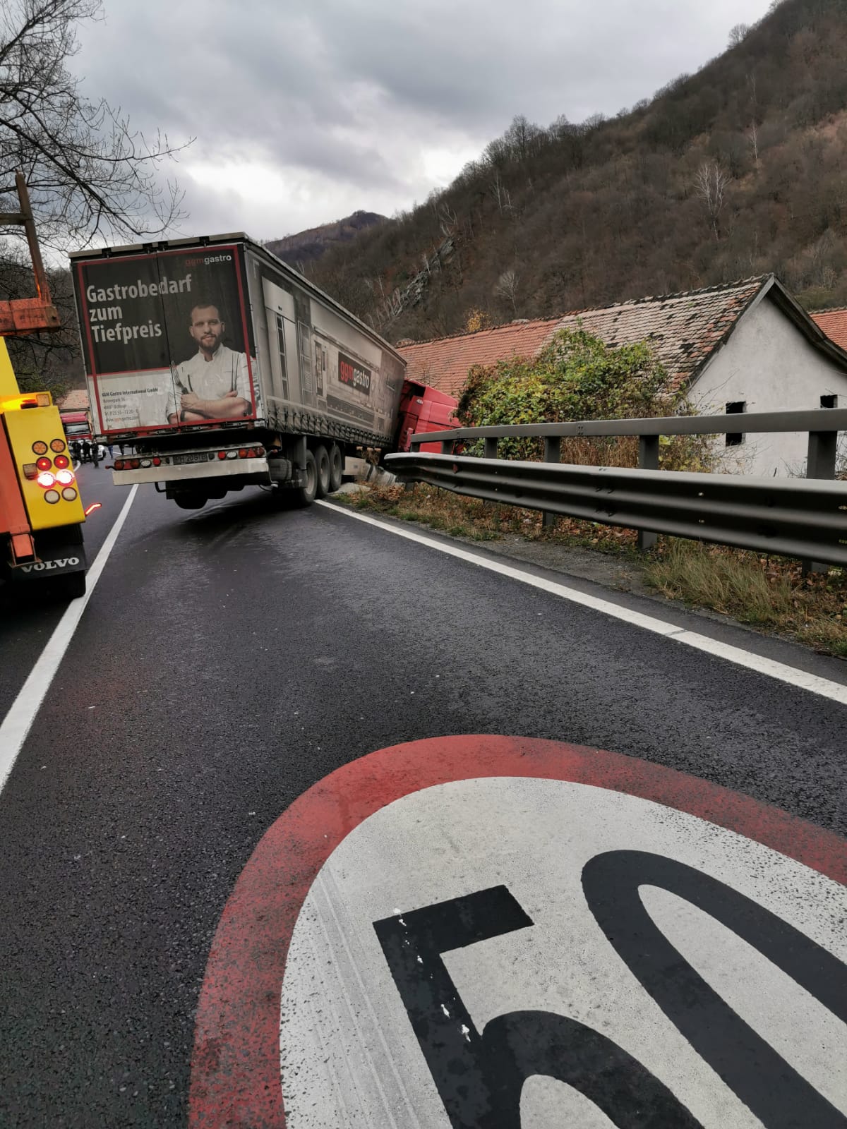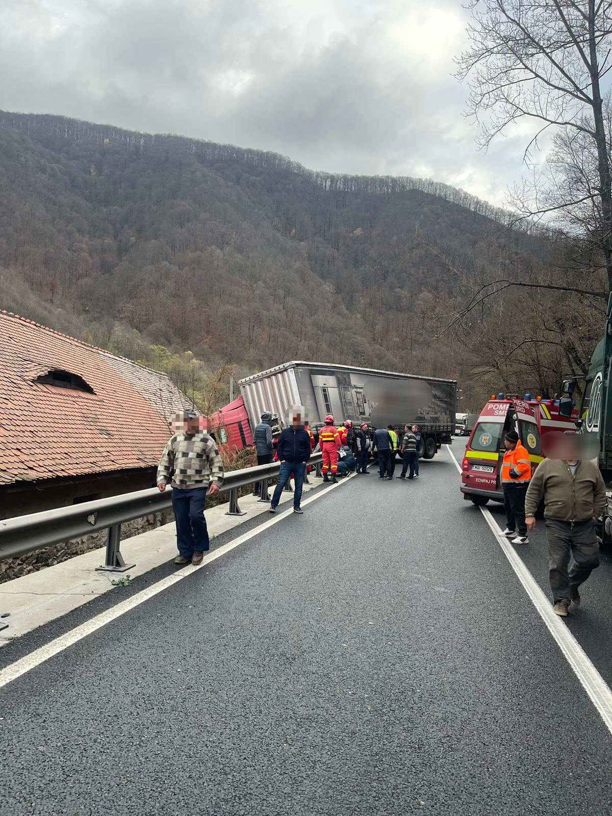 Traficul rutier este blocat pe ambele sensuri pe raza localităţii Lazaret, după ce un TIR s-a izbit de un imobil, în Lazaret, potrivit informaţiilor oferite de Poliţia Sibiu.