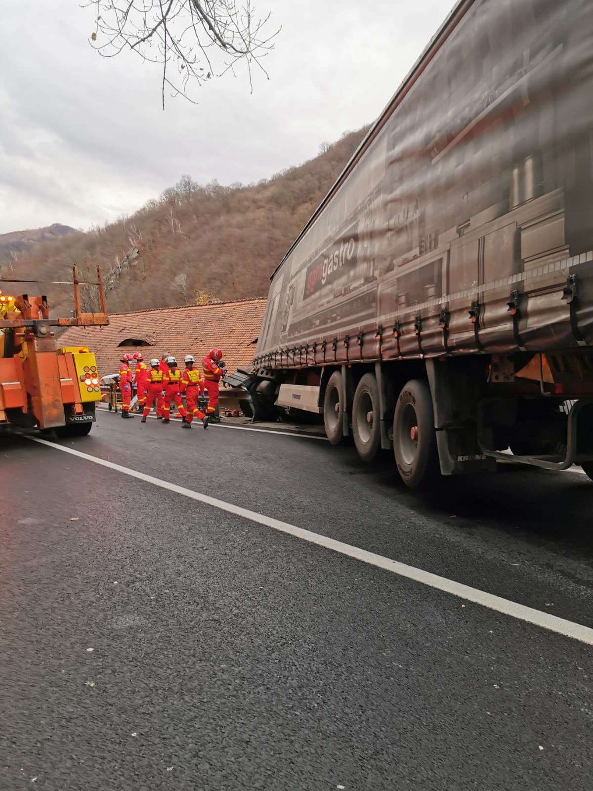 Accident rutier grav pe Valea Oltului, în Lazaret. Şoferul unui TIR este încarcerar după ce s-a izbit de un imobil.