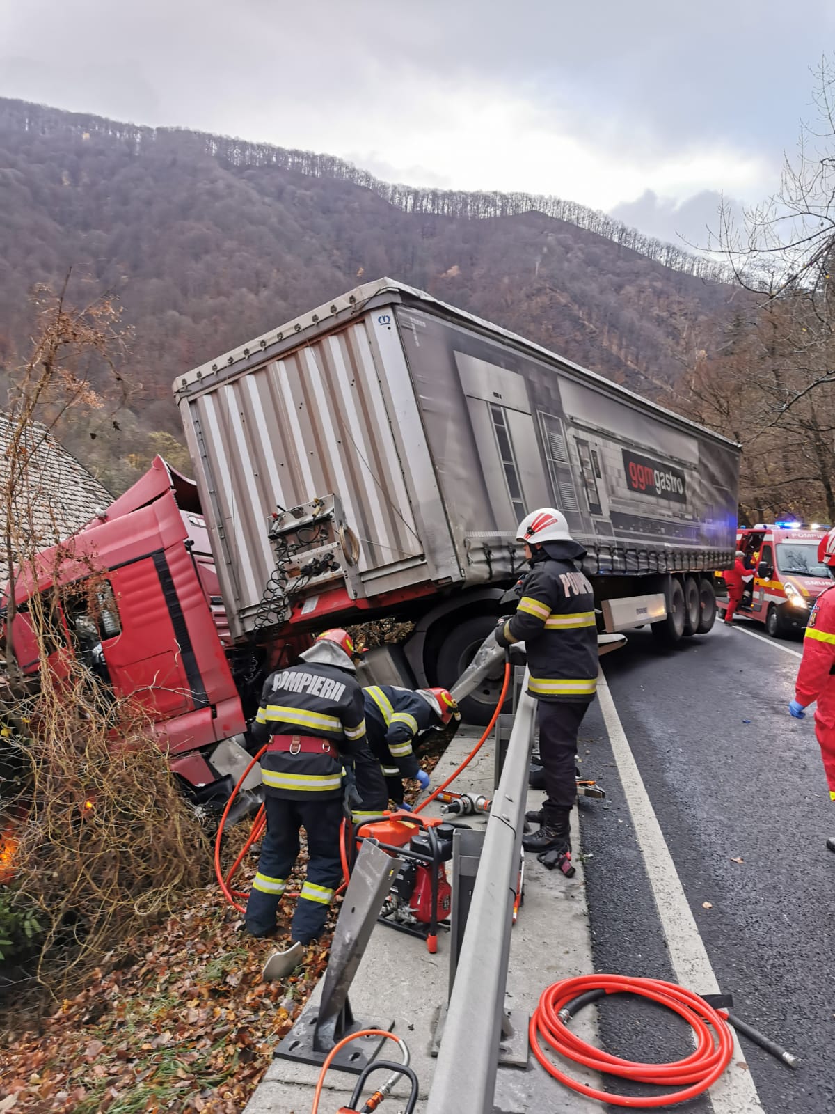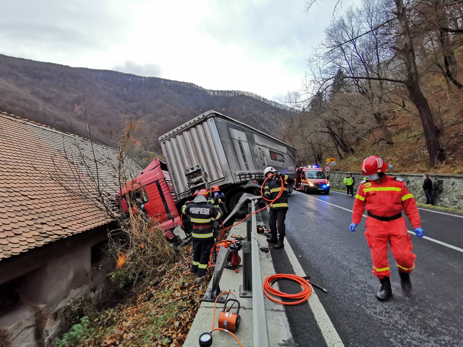 Inspectoratul pentru Situaţii de Urgenţă Sibiu intervine cu două echipaje SMURD şi unul de la Descarcerare. Şoferul TIR-ului, un bărbat în vârstă de 38 de ani, din judeţul Prahova, a fost rănit în urma accidentului.