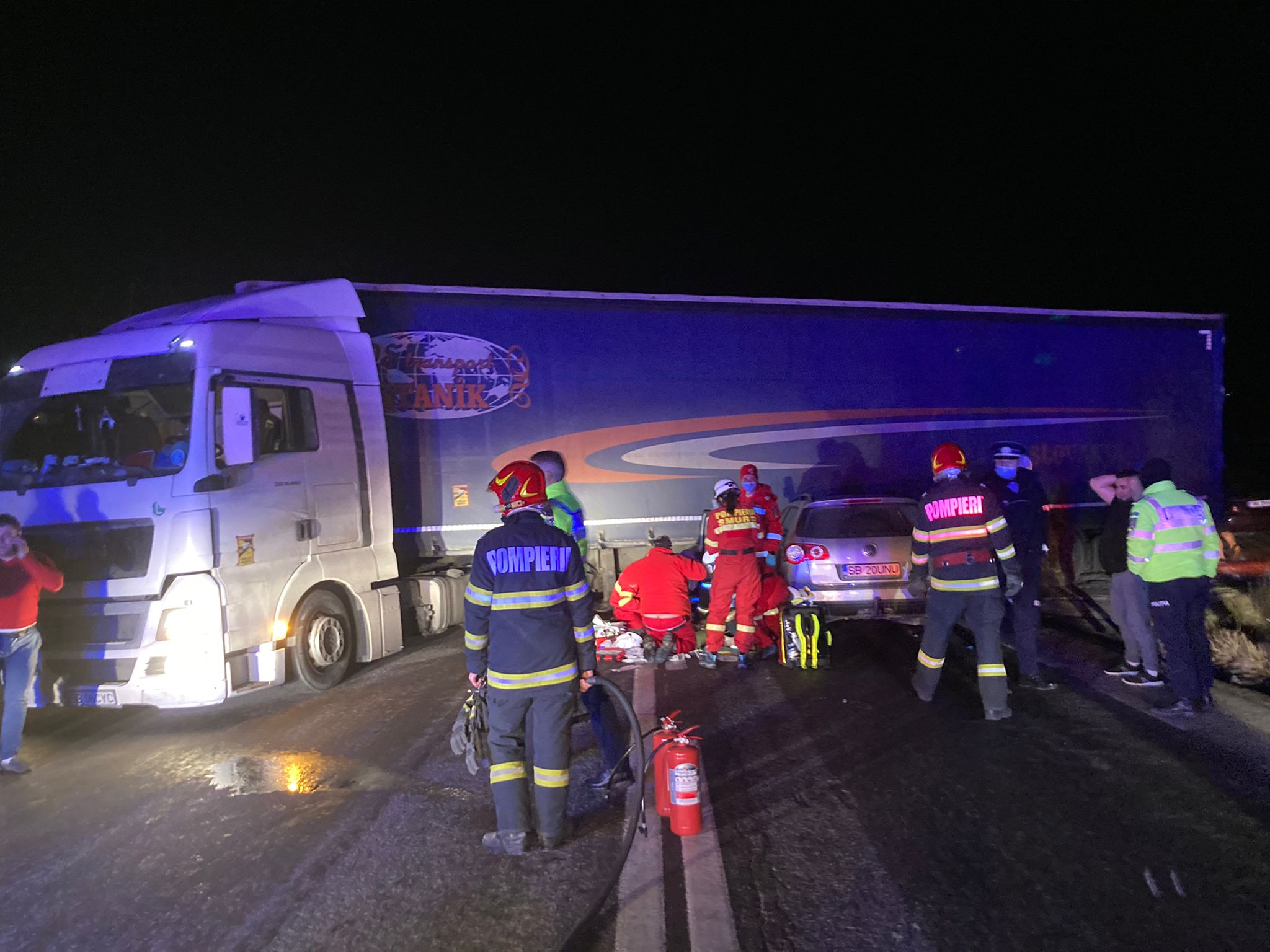 Un echipaj de la Descarcerare, un echipaj de pompieri şi trei echipaje SMURD au intervenit la locul producerii evenimentului. Trei persoane au fost implicate în accident, doi bărbaţi şi o femeie. Este vorba despre şoferul TIR-ului, care a primit îngrijiri medicale şi a refuzat transportul la spital, o femeie care a primit de asemenea asistenţă medicala şi a fost transportată la spital având o fractură la picior şi şoferul autoturismului, care a fost rănit grav şi se afla în stop cardio-respirator în momentul sosirii echipajelor de prim ajutor.