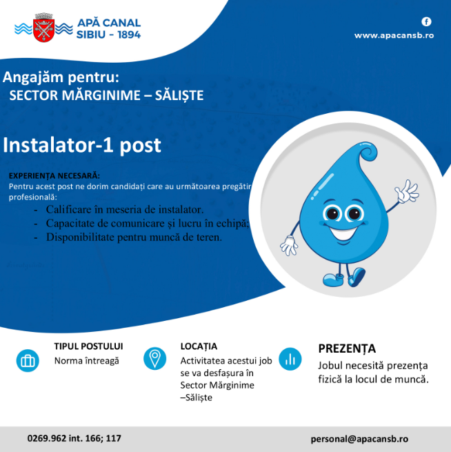 APĂ CANAL SIBIU  S.A. Angajează pentru: SECTOR MĂRGINIME – Săliște