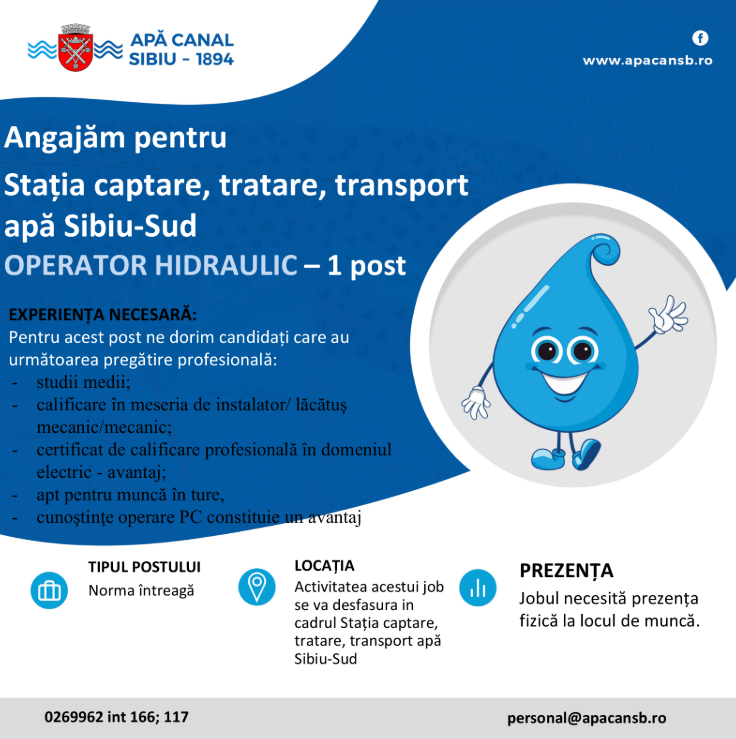 APĂ CANAL SIBIU S.A. angajează pentru: Stația captare, tratare, transport apă Sibiu-Sud