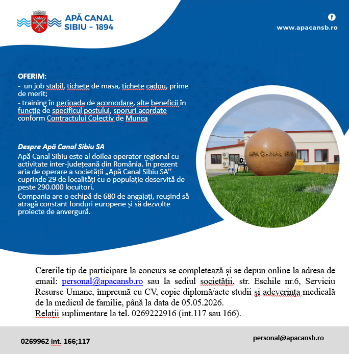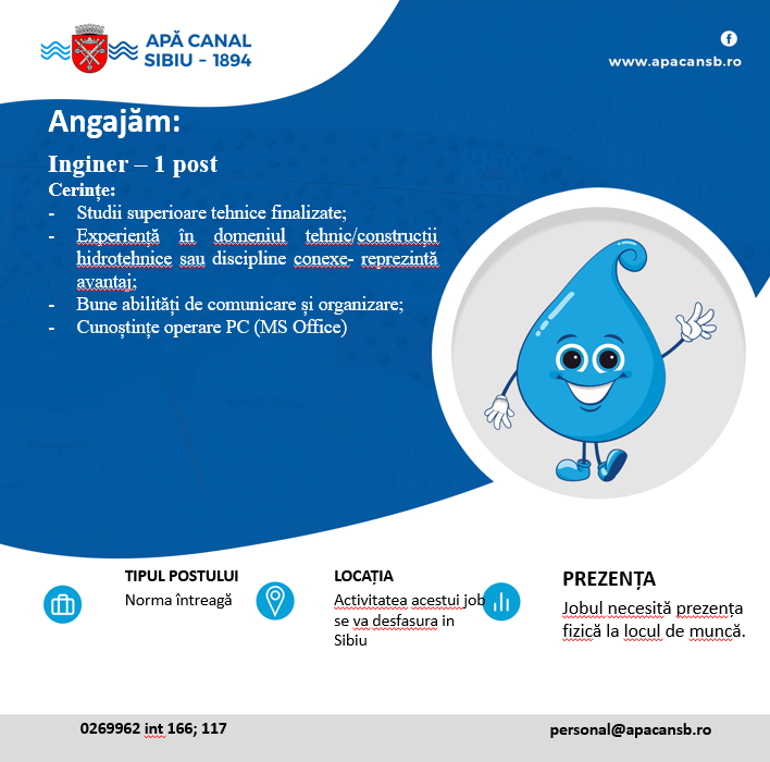 APĂ CANAL SIBIU S.A. Angajează: Inginer – în domeniul tehnic/construcții hidrotehnice sau discipline conexe -1 post