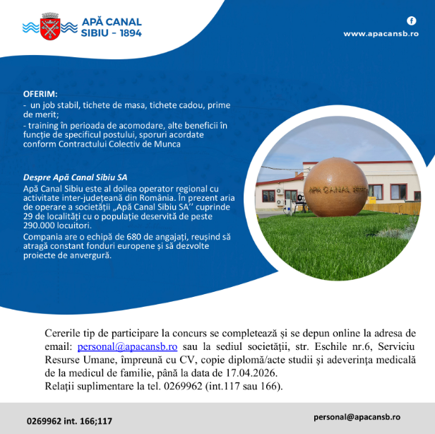 APĂ CANAL SIBIU  S.A. Angajează pentru: Serviciul Administrativ, Call Center