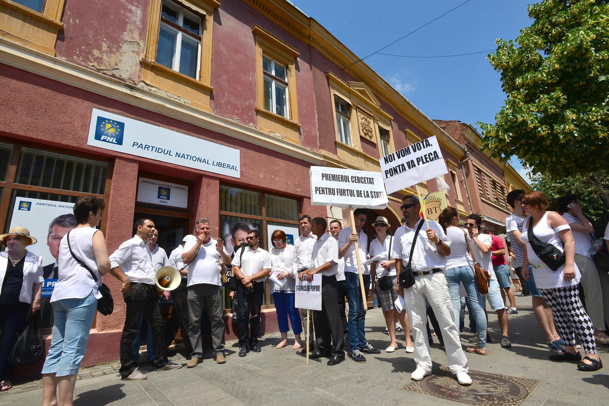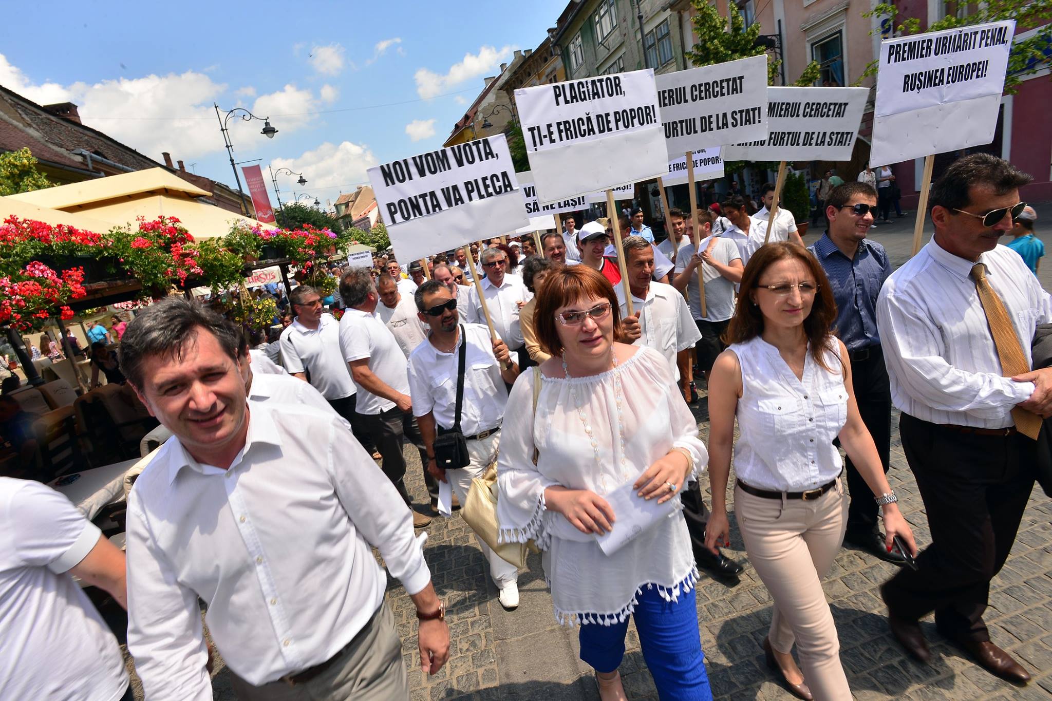 Câteva sute de sibieni au participat vineri, 12 iunie, la un marș de protest organizat de PNL Sibiu pentru susținerea moțiunii de cenzură „Victor Ponta-demis pentru exces de putere prin blocarea alegerilor. Dreptul la vot nu e o lozincă”, supusă la vot în ședința reunită a celor două Camere ale Parlamentului. Participanții au cerut demisia premierului Victor Ponta, pentru că a blocat alegerile și a îngrădit dreptul la vot pentru românii din străinătate. Protestatarii au pornit din fața sediului PNL, de pe strada Nicolae Bălcescu și au mers până la sediul Prefecturii, pe strada Andrei Șaguna. Acolo au scandat lozinci precum „Plagiator, ți-e frică de popor!” , „Votul l-ai blocat, noi te-am amendat!”,  „Victoraș, să ne lași!”, „Premierul cercetat/ Pentru furtul de la stat!”, „Premier urmărit penal, rușinea Europei!”.