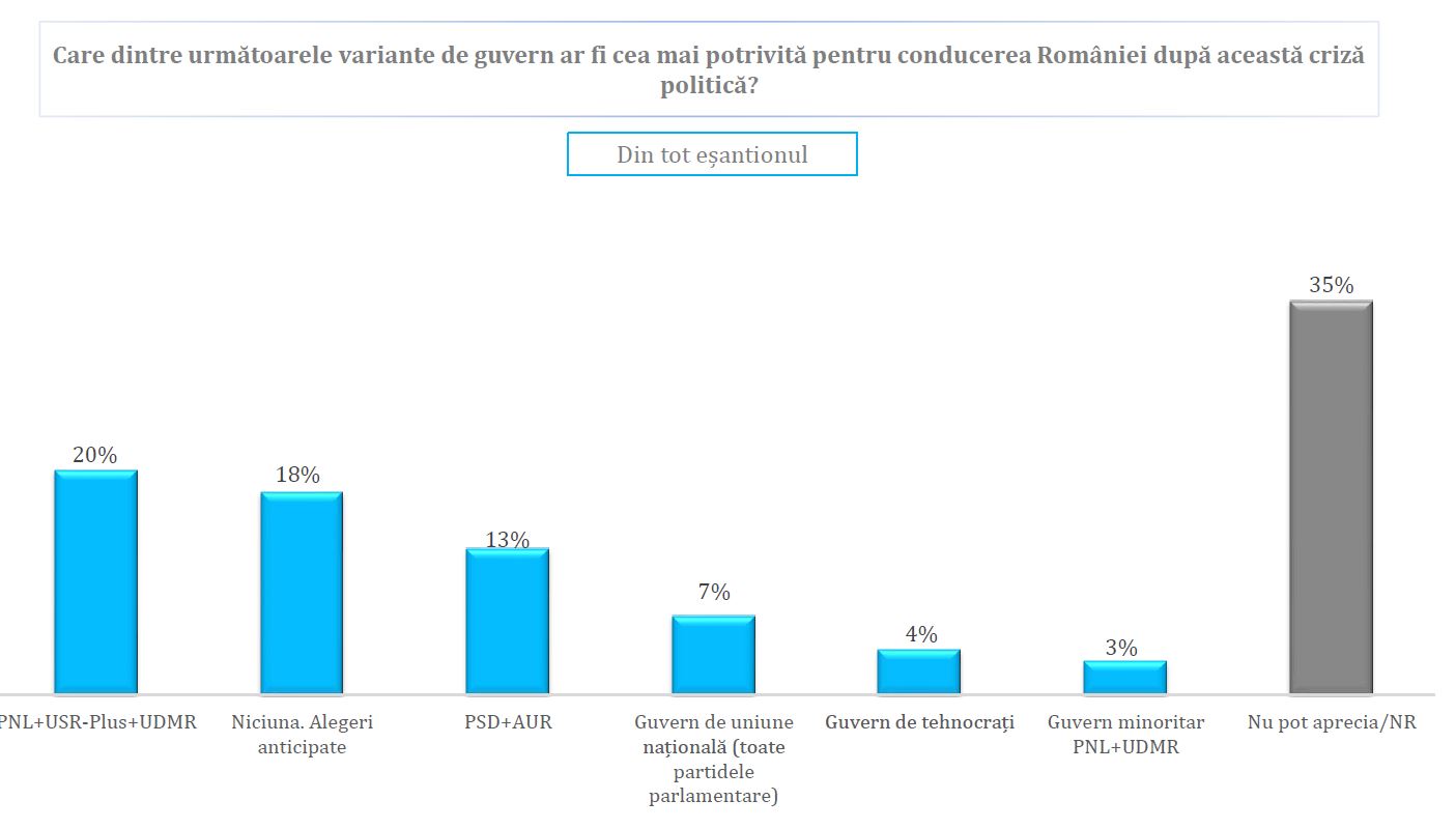 Dintre toate întrebările sondajului Avangarde, realizat în săptămâna 14 – 21 septembrie, cea mai importantă în acest moment este cea referitoare la cine ar vrea românii să guverneze țara. Chiar dacă apar unele contradicții în răspunsuri, cifrele arată că pe primul loc în preferințe se află un guvern PNL – USR PLUS – UDMR (20%). Pe locul al doilea în răspunsuri sunt alegerile anticipate (18%) și abia pe locul al treilea este o combinație PSD – AUR (13%). Cei mai mulți dintre România spun însă că „nu pot aprecia – nu răspund”. Prima concluzie este că românii nu vor neapărat alegeri anticipate, dar dacă s-ar produce, tot coaliția PNL – USR PLUS – UDMR ar fi preferată.