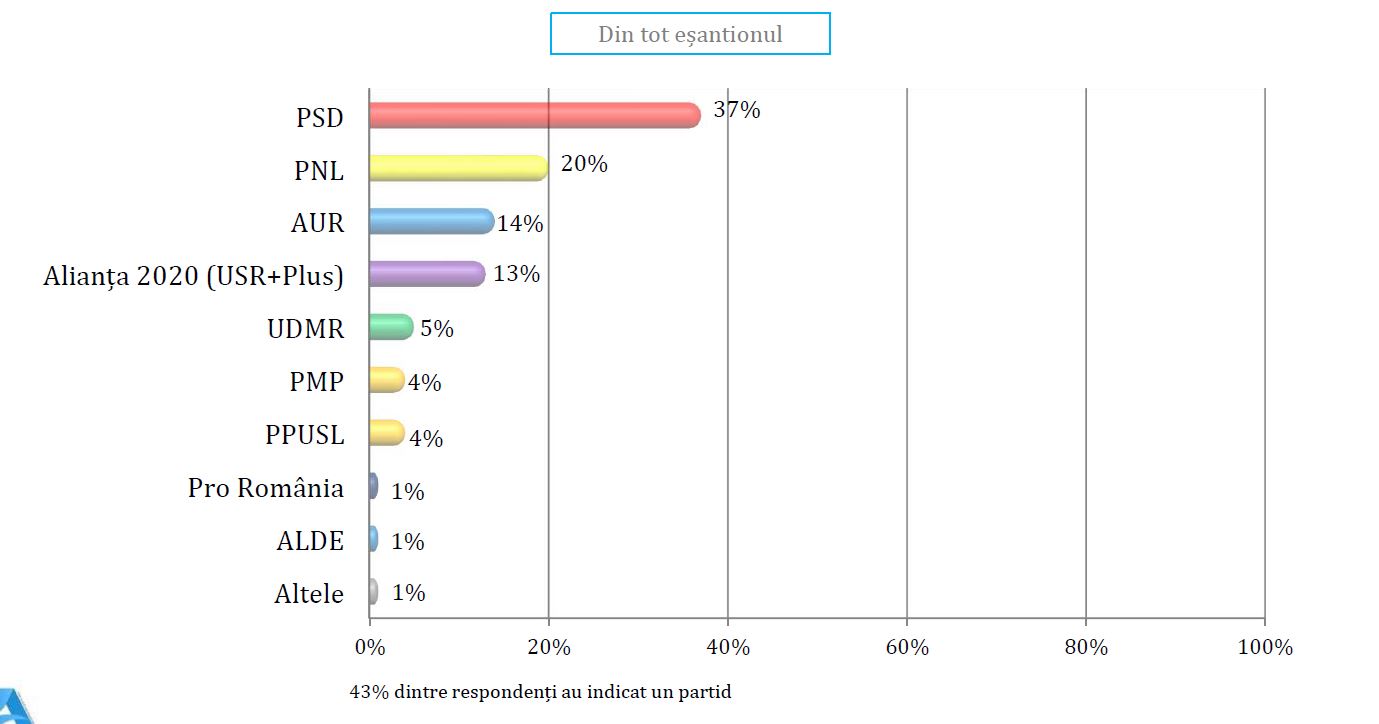 La nivelul partidelor, cifrele trebuie luate cu rezerve, dat fiind faptul că sondajul este comandat de PSD, care are și prima poziție, cu 37 de procente. Este urmat de PNL, cu 20%, de AUR, cu 14%, și USR PLUS, cu 13%. După UDMR, cu 5 procente, restul rămân la niveluri nerelevante.