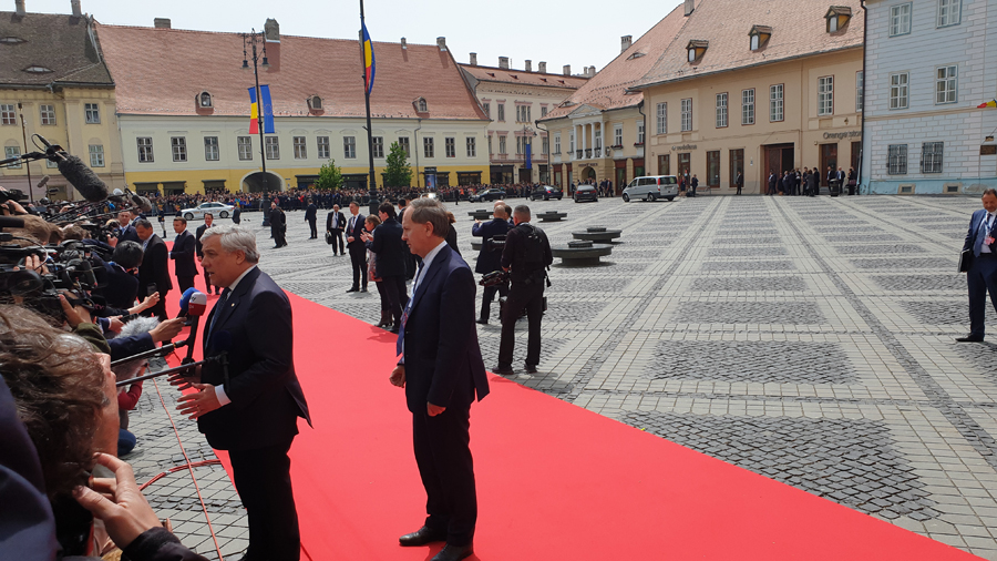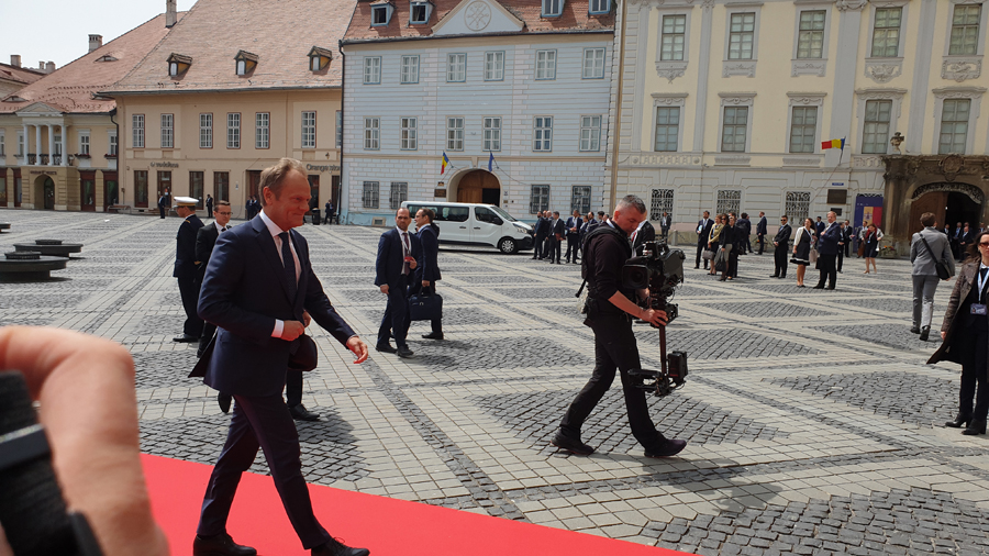 Numele “grele” ale Uniunii Europene, președinți sau premieri ai statelor membre, au sosit pe rând, oprindu-se în fața jurnaliștilor pentru declarații. Jean Claude Junker a oferit unul dintre cele mai directe răspunsuri, care sintetizează scopul Summit-ului de la Sibiu. Întrebat de un jurnalist britanic cum este la primul Summit fără Thereza May și dacă situația Brexitului este un subiect al întâlnirii, Junker a spus: “Nu ne întâlnim aici să discutăm desrpe Brexit, ne întâlnim să discutăm despre ce va fi după Brexit.”. Și Donald Tusk, președintele Consiliului European, s-a arătat optimist, la întrebarea “sunteți încrezător în viitorul UE?”. El a spus fără ezitare “Da!” cu un zâmbet larg. Emanuel Macron a fost mult mai diplomat. Întrebat dacă îi lipsește Thereza May și Marea Britanie, președintele Franței a răspuns “Întotdeauna! Întotdeauna!”. Liderii țărilor UE au intrat în întâlnire, urmând să iasă pentru conferințe de presă separat și apoi la fotografia de grup.