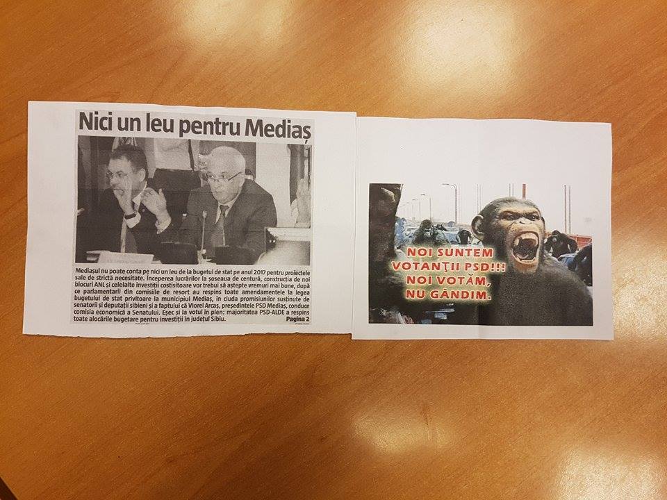 Întregul electoral al PSD a fost jignit după ce în Mediaș au fost împărțite flyere în cutiile poștale ale medieșenilor care locuiesc la case. Afirmația îi aparține senatorului social democrat Viorel Arcaș, care a susținut o conferință de presă în cadrul căreia a vorbit despre respectivele flyere. Arcaș a spus că la Mediaș campania electorală nu s-a încheiat și a spus că se gândește să sesizeze autoritățile în privința flyerelor. „Nu mi se pare corect ce s-a întâmplat în ultimele zile. În cutiile poștale ale unor medieșeni din zona Aurel Vlaicu și Automecanica au fost împărțite flyere prin care electoratul PSD era comparat cu maimuțele. Este total incorect și ne gândim dacă vom sesiza Poliția. Se pare că la Mediaș nu s-a încheiat campania electorală”, a spus Arcaș.