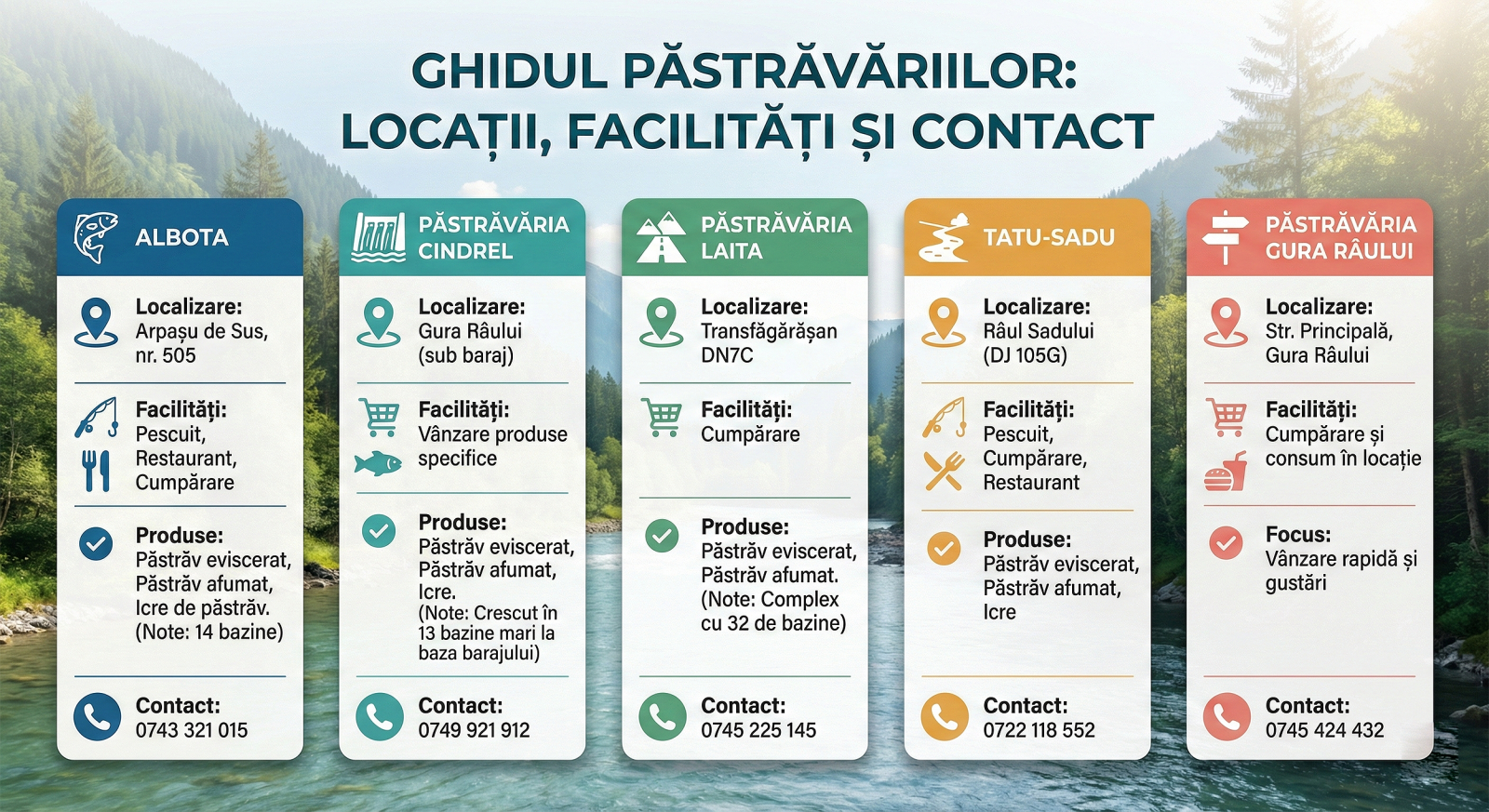 La polul opus, păstrăvăriile orientate spre proximitate și vânzare directă, precum Păstrăvăria Cindrel (sub baraj) sau Laita (pe Transfăgărășan), mizează pe capacități impresionante de stocare — Laita operând nu mai puțin de 32 de bazine — dar cu echipe restrânse de doar 3 angajați, concentrându-se pe calitatea puietului și livrarea către consumatori. Fie că vorbim de puncte de desfacere pe strada principală, cum este cazul Păstrăvăriei Gura Râului, sau de ferme montane izolate, aceste investiții subliniază profilul județului ca lider în acvacultură, oferind opțiuni variate între relaxarea la pescuit și achiziția rapidă de produs proaspăt.