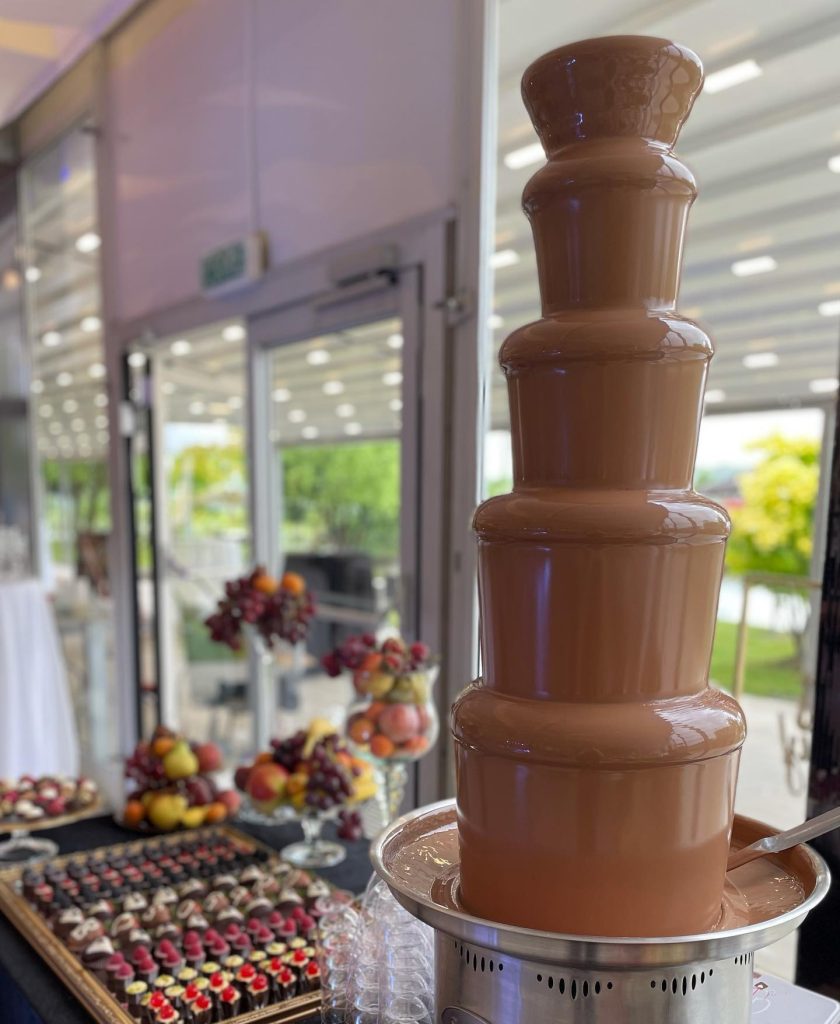 „La nunta noastră ne-a plăcut foarte mult ideea de a avea o fântână de ciocolată. Am închiriat o fântână din Sibiu. Era cea mai mare. Aveam mulți copii care erau încântați de această idee. Serviciul, din păcate, nu a fost la înălțimea așteptărilor noastre. Ne-a plăcut foarte mult ciocolata, ideea de a lucra cu ciocolată, pentru că e mult mai deosebită decât o prăjitură clasică. Un an de zile, după nuntă, ne-am gândit dacă nu cumva noi am putea să facem un serviciu mult mai calitativ, care să vină, în primul rând, în întâmpinarea clienților. Oricât de frumoasă e fântâna de ciocolată, ea trebuie servită într-un mod calitativ și ușor pentru invitați. Așa a început aventura noastră cu ciocolata”, povestește Cătălin.