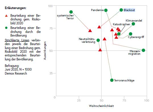 Potrivit analizei de ansamblu, ilustrată de un grafic sugestiv, dimensiunea acestei amenințări este la fel de mare precum cea a Covid-19 (raportul fiind realizat la începutul acestui an) sau a unei emenințări teroriste. Orizontul de timp prevăzut de grafic este de 1 – 3 ani, cu termene care pornesc de la amenințările „actuale”, precum Covid-19 sau conflictul SUA – China, trece prin zona „foarte probabile”, cu amenințări cibernetice sau atacuri teroriste, și ajunge la zona centrală a graficului, cu riscuri „probabile”, unde se regăsește pe primul loc „Blackout”-ul energetic. Mai sunt și categoriile „posibile” și „cunoscute” ale riscurilor mai puțin probabile în perioada următoare, aici intrând o slăbire a NATO, un blocaj al UE sau o altă pandemie, denumită „Pandemia X”.