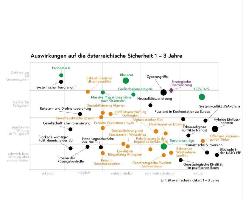Structurile militare ale Austriei realizează în mod regulat analize privind securitatea națională și contextul internațional care ar putea genera probleme Austriei, în funcție de tipul de eveniment și de amenințare. Raportul din 2021, realizat de Direcția pentru Politici de Securitate, se numește „Siguranță. Și mâine?”, având ca autor Institutul de Menținere a Păcii și Managementul Conflictelor. Este fără îndoială că vorbim despre specialiști, analiști politici, militari și de securitate care au la îndemână instrumentele cele mai valoroase pentru a realiza predicții științific argumentate. Publicația face precizarea că nu reprezintă poziția oficială a Ministerului Federal al Apărării din Austria, ci reprezintă punctul de vedere personal al experților.