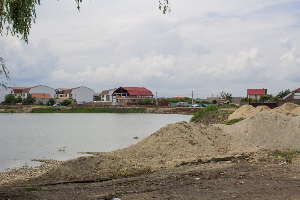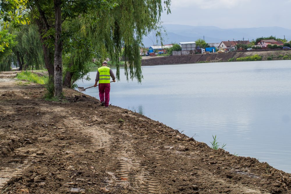 A trecut o jumătate de an și eram extrem de curioși să vedem în ce stadiu se află lucrările și dacă acestea vor fi gata la timp. Pe lac, în jurul amiezii, atmosfera era una liniștită, fără prea multă agitație. Nici prea multe schimbări față de cum arăta înainte locul n-am observat. Un excavator nivela malul de pe partea stângă a lacului, așa cum îl priveam noi, cu spatele la cartierul Țiglari, în timp ce un muncitor tot aranja pământul cu o cazma. Undeva, în partea dreaptă, departe de lac, cinci muncitori ascultau atenți indicații prețioase. Am văzut mormanele de nisip ce vor acoperi plaja, malul din partea dreaptă cu semne clare că s-a lucrat la el cândva, dar că nu s-a mai intervenit de ceva vreme, pentru că vegetația și-a reluat serios locul. Din fericire șeful de șantier era la datorie așa că ne-a putut spune ce se întâmplă, de fapt acolo.