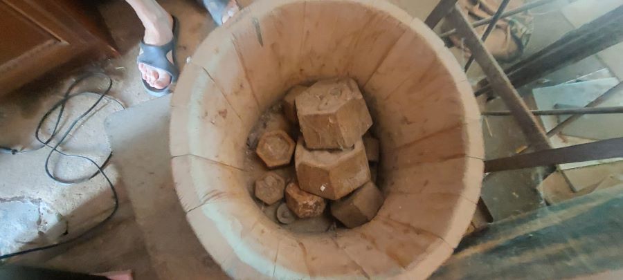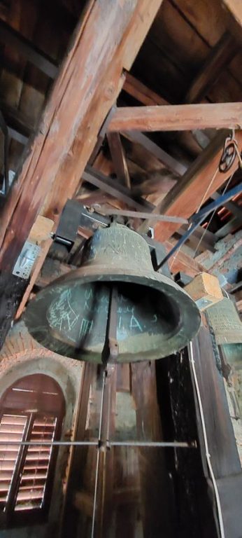 „Eu stau mai jos, la două case, am copilărit în moara aceasta!”, îmi spune Ovidiu, căci așa mi s-a prezentat. Deschide o poartă mare și se vede clădirea unde se află moara. Ușa e veche, o trage și mă izbesc cu ochii de o grindă pe care care scrie 1884, cică de atunci datează moara. Sub acea grindă sunt niște scări de lemn, pe care trebuie să le urci ca să ajungi la cuvă. Lângă cuvă, un clopot. „Clopotul se agăța în cuvă cu un lanț. Când se găta de măcinat, clopotul începea să sune. Când venea cineva cu jumătate de sac, ce să pui… nici nu băgai bine în coș boabele de porumb, că suna deja”, îmi spune râzând locuitorul din Galeș.