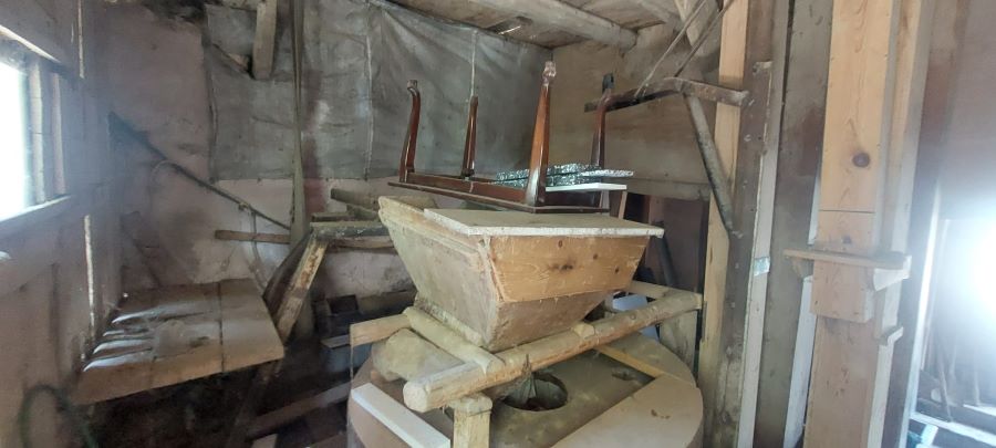Mă plimbă prin toată moara, observ că aproape tot mecanismul este din lemn. „Sus era moara de grâu, jos se făcea urluiala și făina de porumb”, îmi spune ghidul meu. „Colo era căsuța, cum îi spuneam noi. Când mergeam iarna la măcinat, făceam focul și ne încălzeam acolo. Apoi mergeam și trăgeam făina la vale. Tot iarna înghețau cupele de pe roțile de afară și băteam la gheață de ne venea rău”, povestește nostalgic Ovidiu.