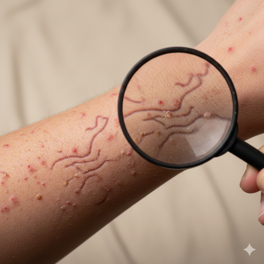 - șanțul scabios (linii fine, șerpuitoare, prin care parazitul inainteaza pe sub piele
