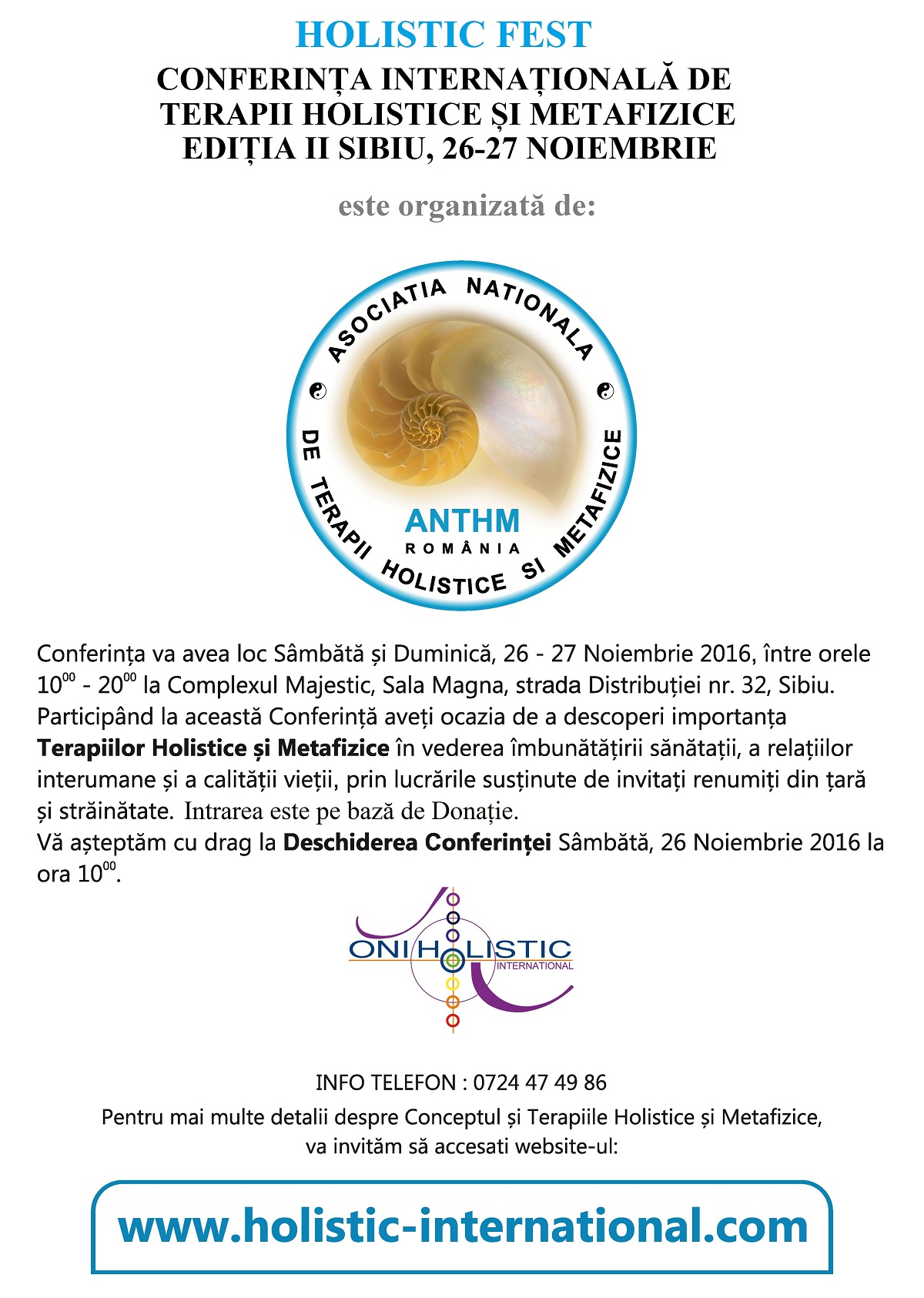 În orașul Sibiu se desfășoară CONFERINȚA – HOLISTIC FEST, organizată de către Asociația Națională de Terapii Holistice și Metafizice, unde sunt promovate Terapiile Alternative, Complementare, Holistice (holistic vine de la cuvântul holos din limba greacă, care înseamnă întreg ) și Metafizice (metafizic înseamnă spiritual sau tot ce este dincolo de materie).
