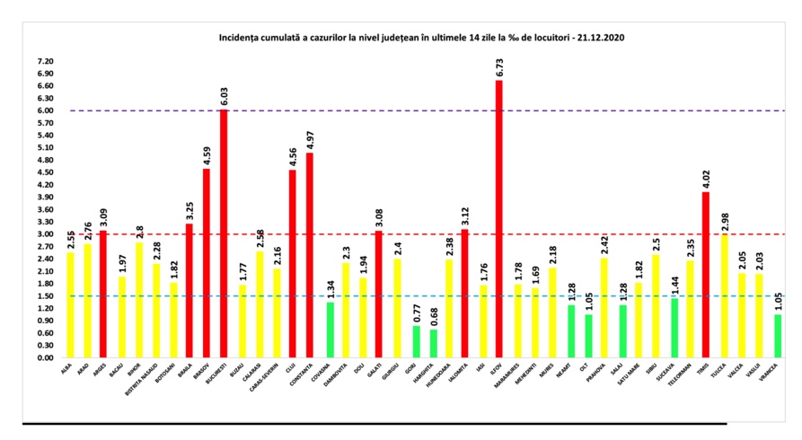 Coeficientul infectărilor cumulate la 14 zile, raportate la 1.000 de locuitori este calculat de către Direcțiile de Sănătate Publică, la nivelul Municipiului București și al județelor. Mai jos aveți graficul realizat în baza raportărilor primite de CNCCI de la Direcțiile de Sănătate Publică: