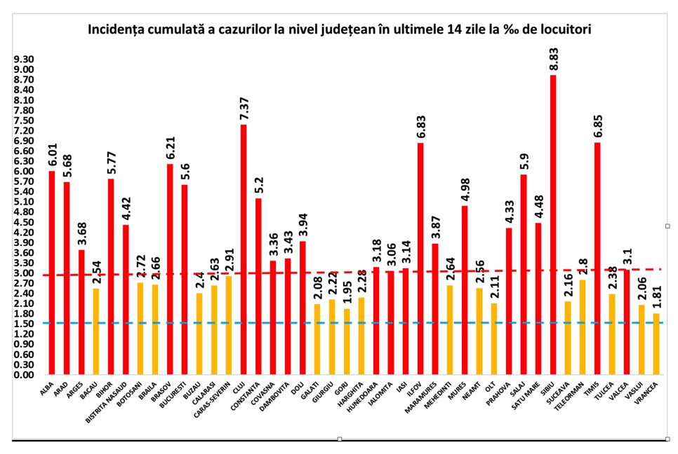 Coeficientul infectărilor cumulate la 14 zile, raportate la 1.000 de locuitori este calculat de către Direcțiile de Sănătate Publică, la nivelul Municipiului București și al județelor. Mai jos aveți graficul realizat în baza raportărilor primite de CNCCI de la Direcțiile de Sănătate Publică: