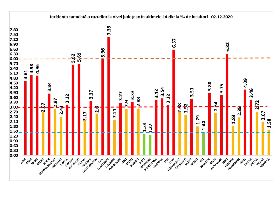 Coeficientul infectărilor cumulate la 14 zile, raportate la 1.000 de locuitori este calculat de către Direcțiile de Sănătate Publică, la nivelul Municipiului București și al județelor. Mai jos aveți graficul realizat în baza raportărilor primite de CNCCI de la Direcțiile de Sănătate Publică: