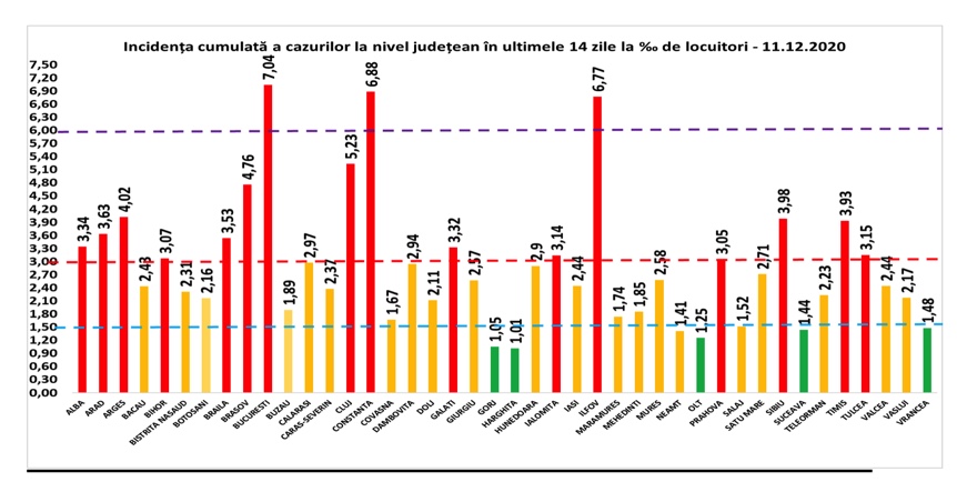 Coeficientul infectărilor cumulate la 14 zile, raportate la 1.000 de locuitori este calculat de către Direcțiile de Sănătate Publică, la nivelul Municipiului București și al județelor. Mai jos aveți graficul realizat în baza raportărilor primite de CNCCI de la Direcțiile de Sănătate Publică: