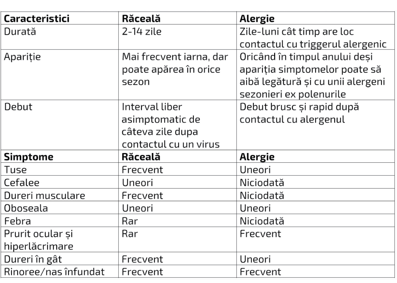 În tabelul de mai jos observăm diferențele clare dintre alergie și viroză respiratorie: