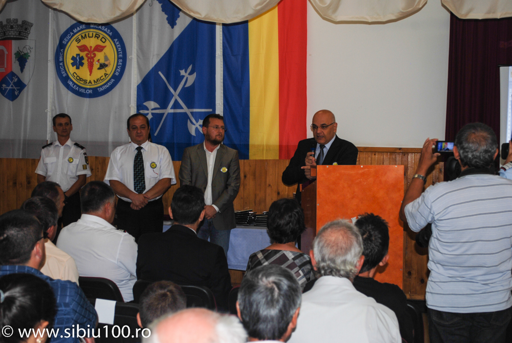 ”Munca care s-a făcut la Copșa Mică, este munca dumneavoastră. Pentru că aici în frunte cu domnul primar și cu ceilalți reprezentanți ai primăriilor partenere, Consiliul Județean, ISU Sibiu, se află cei care au suportat și continuat să lucreze în acest domeniu, chiar și cu venituri, care pto să spun că sunt foarte modeste. Numai așa ați reușit acest lucru. Mâine dacă acest echipaj nu ar fi, o să vă lipsească în maxim 2-3 zile. Numărul de intervenții rezolvate este foarte mare, vorbim de aproape 2.000 de intevenții pe an, au fost salvate vieți, o să crească nivelul lor competență și fără colaborarea comunității, acest lucru nu este posibil”, a explicat Raed Arafat.