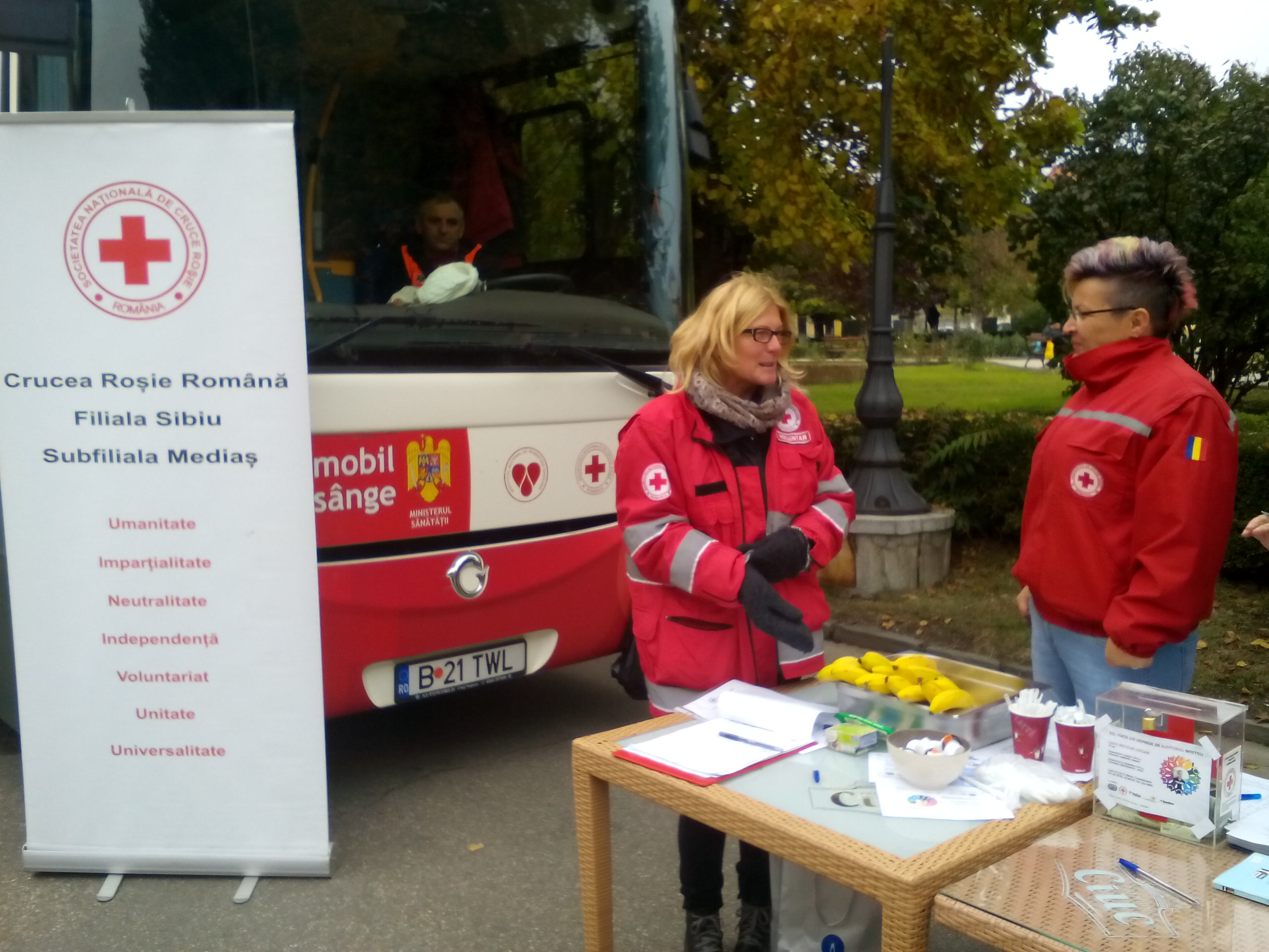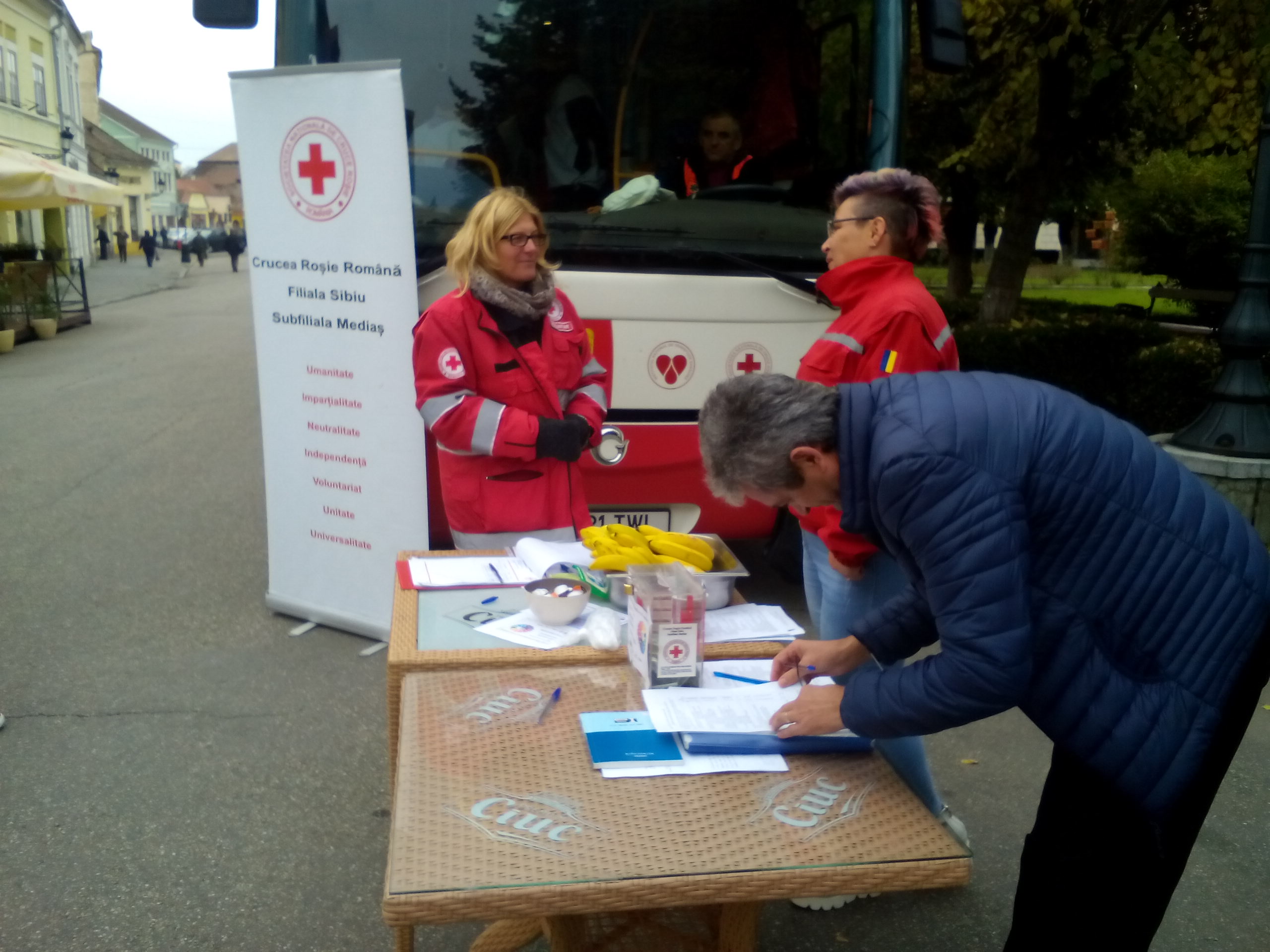 25 de medieșeni s-au prezentat miercuri dimineața în Piața Regele Ferdinand din oraș pentru a dona sânge și a ajuta în acest fel semenii aflați în suferință. Unitatea mobilă a Centrului de Transfuzie Târgu Mureş, alături de Crucea Roşie Subfiliala Mediaş şi I Love Mediaş au organizat a 4-a sesiune mobilă de donare de sânge, miercuri dimineața în centrul istoric al municipiului Mediaș. Sângele recoltat va fi folosit, pentru pacienţii cu arsuri grave sau cei care sunt supuşi unor operaţii complexe, pentru bolnavii de leucemie şi pentru victimele accidentelor rutiere. Prin cei 450 de mililitri recoltaţi de la un singur donator, până la trei victime pot fi ajutate să se recupereze. În urma donării, sângele donatorului este improspătat, imunitatea organismului creşte, riscurile de paralizie şi de accident vascular se reduc cu aproximativ 30%. „Încă de săptămâna trecută de când am anunăat organizarea acestei sesiuni de recoltare s-au înscris multe persoane. Astăzi au donat 25 de medieșeni iar surpriza plăcută a fost că și persoane care treceau prin centru au dorit să se înscrie și să doneze. Noi organizăm în acest moment două asemenea sesiuni pe an, primăvara și toamna, însă ne dorim ca pe viitor să organizăm 3 asemenea activități în fiecare an”, a spus Iuliana Ungar, voluntar al Crucii Roșii Mediaș.