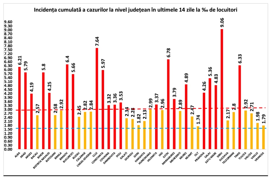 Coeficientul infectărilor cumulate la 14 zile, raportate la 1.000 de locuitori este calculat de către Direcțiile de Sănătate Publică, la nivelul Municipiului București și al județelor. Mai jos aveți graficul realizat în baza raportărilor primite de CNCCI de la Direcțiile de Sănătate Publică: