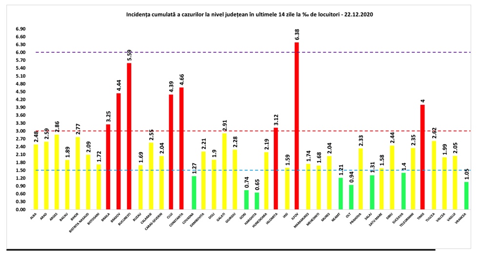 Coeficientul infectărilor cumulate la 14 zile, raportate la 1.000 de locuitori este calculat de către Direcțiile de Sănătate Publică, la nivelul Municipiului București și al județelor. Mai jos aveți graficul realizat în baza raportărilor primite de CNCCI de la Direcțiile de Sănătate Publică: