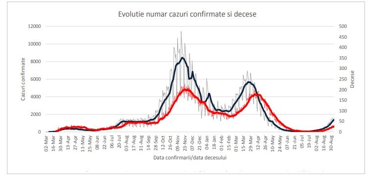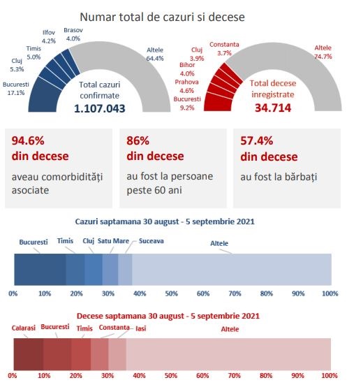 În săptămâna 30 august-5 septembrie 2021, 37,1% din totalul cazurilor s-au înregistrat în Bucureşti, Timiş, Cluj, Satu Mare şi Suceava. De asemenea, 35,6% din totalul deceselor au fost înregistrate în Călăraşi, Bucureşti, Timiş, Constanţa şi Iaşi.