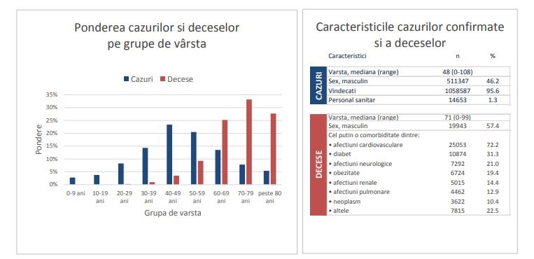 Până la 5 septembrie 2021, din totalul deceselor analizate, vârsta medie a persoanelor decedate era de 71 de ani, 57,4% (19.943 persoane) fiind de sex masculin. De asemenea, 94,6% dintre persoanele decedate aveau cel puţin o comorbiditate: afecţiuni cardiovasculare (72,2% – 25.053 de persoane), diabet (31,3% – 10.874 de persoane), afecţiuni neurologice (21% – 7.292 de persoane), obezitate (19,4% – 6.724 de persoane), afecţiuni renale (14,4% – 5.015 persoane), afecţiuni pulmonare (12,9% – 4.462 de persoane), neoplasm (10,4% – 3.622 de persoane), altele (22,5% – 7.815 persoane), relevă raportul CNSCBT.